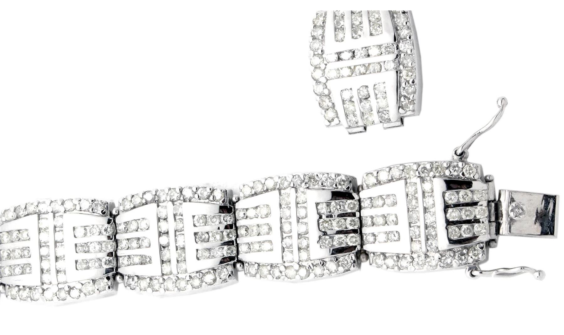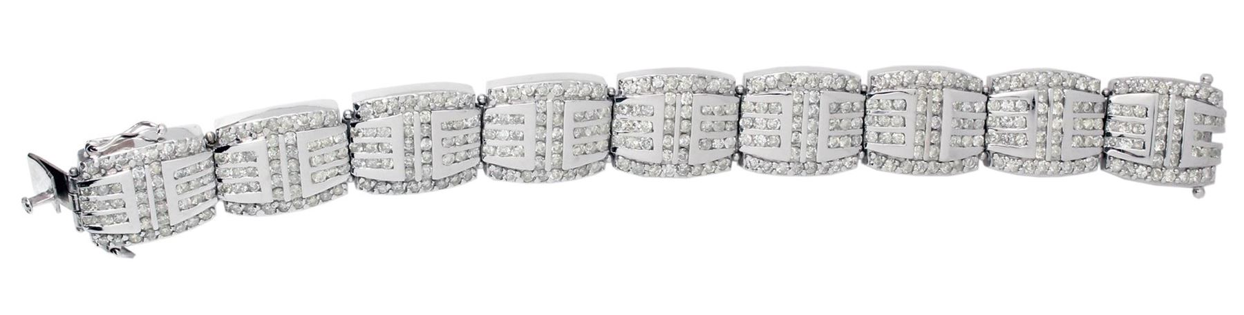 One electronically tested 14KT white gold ladies cast bracelet with a hidden box clasp with safety closer with a bright polish finish. Measurements: 8" in length Identified with markings of "14K". Length can be adjusted by simply removing a piece. Condition is pre-owned. Center Bracelet set with 280 channel setting with round cut natural diamonds, measuring 2.1mm,approximate total weight of 7.6 ct. Clarity: SI-2. Color: H - I, Cut is Good. 160 prong set round brilliant cut diamonds, measuring 2.1mm. approximate total weight of 5.6ct. Clarity: SI-1. Color: H-I, Cut is Good. All diamonds are graded in the mounting, unless otherwise stated. Total Weight of Diamonds 13.2ct. Total Weight of Bracelet 55 grams.
