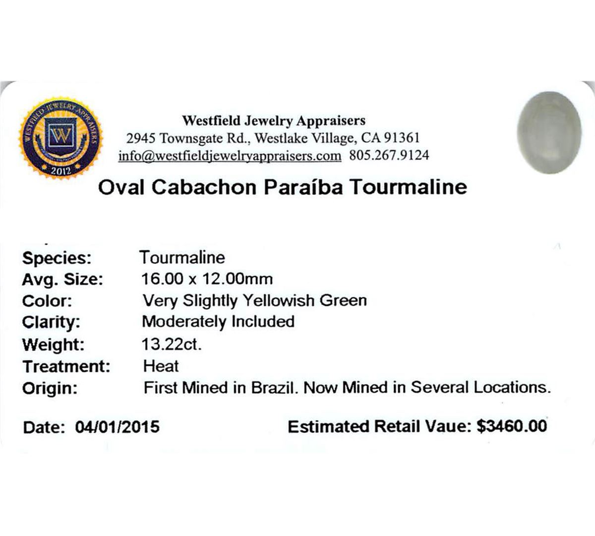 One oval cabochon cut natural Paraiba tourmaline exact weight 13.22ct., clarity is moderately included, cut is good. Westfield Appraised at $3,460.00.