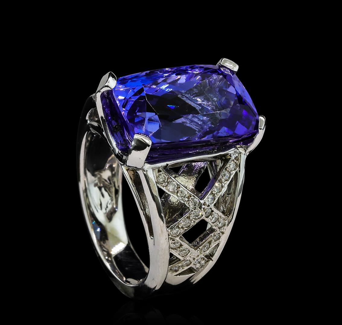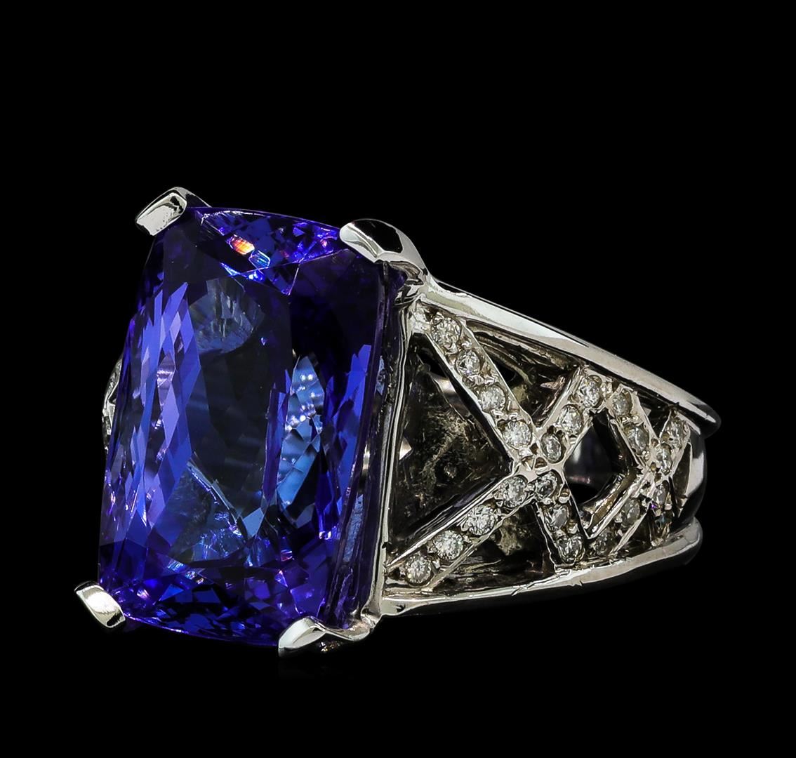 One electronically tested 14KT white gold lady's cast fashion ring with a tapered shank with a bright polish finish. The featured lady's ring has a shank measuring 4.42 millimeters wide. Identified with markings of '14K'. Condition is new, good workmanship. Containing: One prong set rectangular cushion modified brilliant cut natural tanzanite, measuring 15.75 x 10.17 x 8.94mm, (depth est.) 17%. bulge factor, approximate weight of 13.27ct., clarity is eye clean, medium dark, strong, violetish blue color, (GIA vB 6/5), cut is very good. Transmitting light with no distortion, transparent. Colored gemstones are presumed to have been subjected to commonly used enhancement processes. Graded in the setting. Forty-Four bead set round brilliant cut diamonds, measuring 1.20 - 1.15 x 0.71mm (depth est.) approximate total weight of 44 Stones = 0.26ct. Graded in the setting. Clarity SI-1 to I-1. Color: H - I Cut Good. Total Weight of Colored Stones 13.27ct.. Total Weight of Diamonds 0.26ct.. Total Weight of Ring 11.20gm. GAS Appraised at $22,590.00.