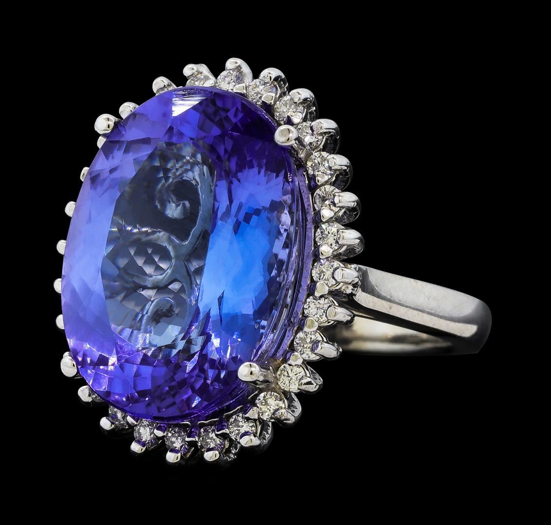 One electronically tested 14KT white gold lady's cast fashion ring with a basket halo with a bright polish finish. The featured lady's ring has a shank measuring 2.55 millimeters wide. Identified with markings of '14K'. Condition is new, good workmanship. Containing: One prong set oval modified brilliant cut natural tanzanite, measuring 17.74 x 13.01 x 8.20mm, (depth est.) approximate weight of 13.30ct., clarity is eye clean, medium, moderately strong, violetish blue color, (GIA vB 5/4), cut is very good. Transmitting light with no distortion, transparent. Colored gemstones are presumed to have been subjected to commonly used enhancement processes. Graded in the setting. Twenty-Eight prong set round brilliant cut diamonds, measuring 1.60 - 1.50 x 0.96mm (depth est.) approximate total weight of 28 Stones = 0.40ct. Graded in the setting. Clarity VS-2 to SI-2. Color: H - I Cut Good. Total Weight of Colored Stones 13.30ct.. Total Weight of Diamonds 0.40ct.. Total Weight of Ring 9.50gm. GAS Appraised at $17,855.00.