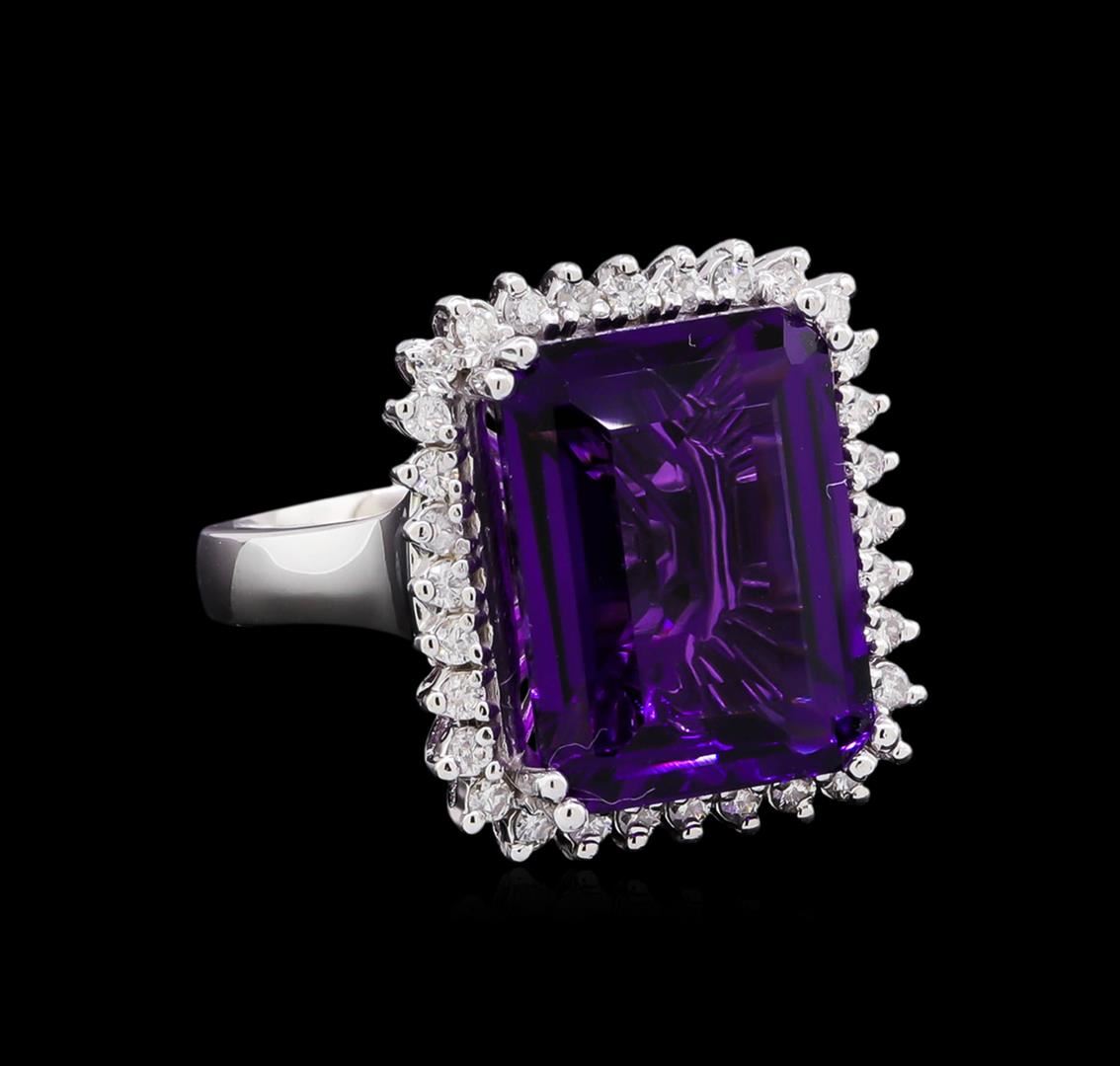 One ring featuring: 14KT white gold weighing 10.28 grams containing one amethyst with a total weight of 13.48ct and diamonds with a total weight of 0.50ct.