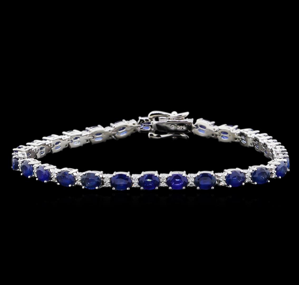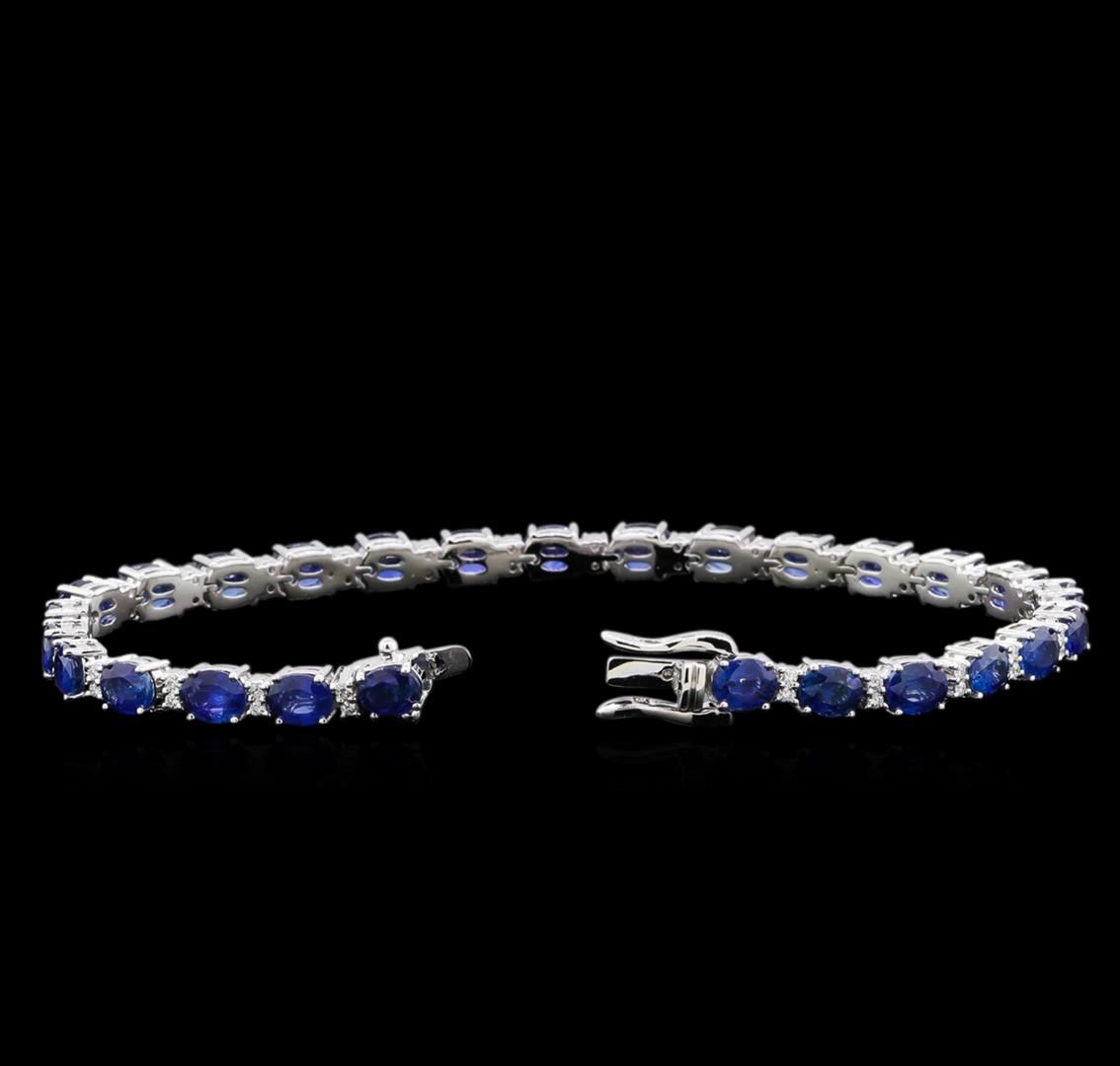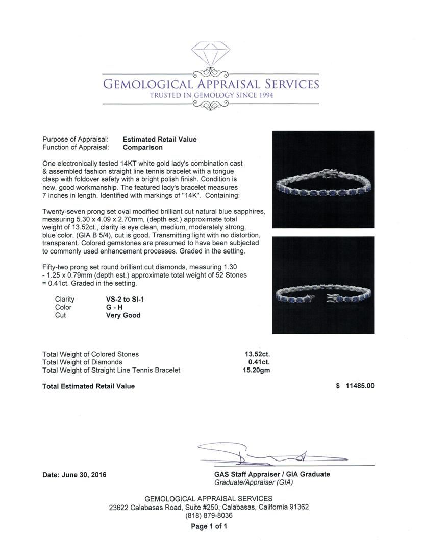 One electronically tested 14KT white gold lady's combination cast & assembled fashion straight line tennis bracelet with a tongue clasp with foldover safety with a bright polish finish. The featured lady's bracelet measures 7 inches in length. Identified with markings of "14K". Condition is new, good workmanship. Containing: Twenty-seven prong set oval modified brilliant cut natural blue sapphires, measuring 5.30 x 4.09 x 2.70mm, (depth est.) approximate total weight of 13.52ct., clarity is eye clean, medium, moderately strong, blue color, (GIA B 5/4), cut is good. Transmitting light with no distortion, transparent. Colored gemstones are presumed to have been subjected to commonly used enhancement processes. Graded in the setting. Fifty-Two prong set round brilliant cut diamonds, measuring 1.30 - 1.25 x 0.79mm (depth est.) approximate total weight of 52 Stones = 0.41ct. Graded in the setting. Clarity: VS-2 to SI-1. Color: G - Very Good. Total Weight of Colored Stones 13.52ct. Total Weight of Diamonds 0.41ct. Total Weight of Straight Line Tennis Bracelet 15.20gm. GAS Appraised at $11,485.00.