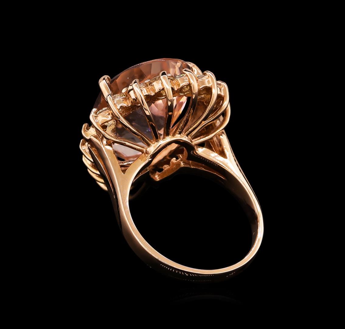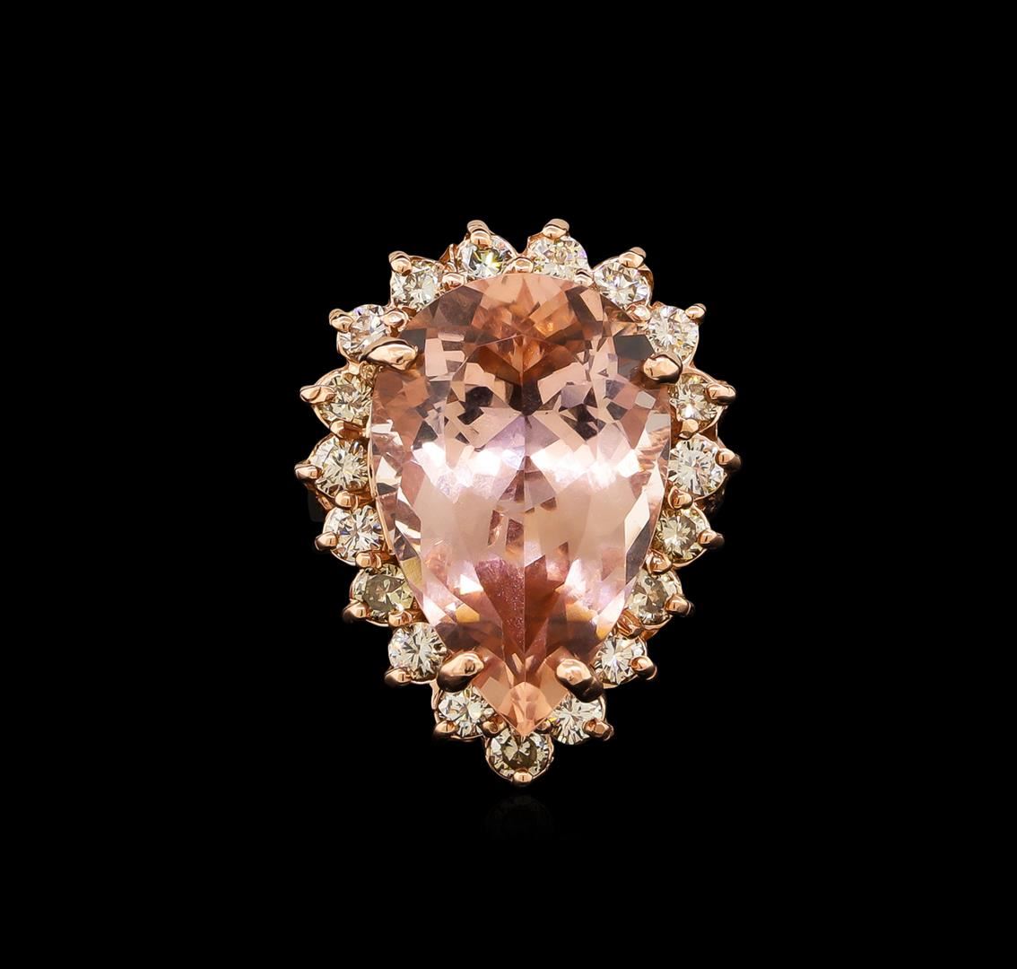 One electronically tested 14KT rose gold ladies cast morganite and diamond ring with a bright polish finish. The featured morganite is set within a diamond floret supported by a ribbed under gallery and split shoulders, completed by a two millimeter wide band. Identified with markings of "K14". Condition is new, good workmanship. Containing: One prong set pear mixed cut natural morganite, measuring 20.50 x 13.20 x 9.20mm, approximate weight of 13.54ct., clarity is slightly included, type I, light, very slightly brownish, orangy red color, (GIA oR 3/3), cut is good. Transmitting light with a minimum of distortion, transparent. Naturally occurring internal & external characteristics are present. Colored Stone Grading Report attached. Graded in the setting. Nineteen prong set round brilliant cut diamonds, measuring 2.50 - 2.50 x 1.50mm (depth est.) approximate total weight of 19 Stones = 1.18ct. The group is composed of a mix of natural faint, very light and light brown color diamonds. Graded in the setting. Clarity: VS-2 to SI-2. Total Weight of Colored Stones 13.54ct. Total Weight of Diamonds 1.18ct. Total Weight of Ring 9.73gm. AIG Appraised at $12,555.00.