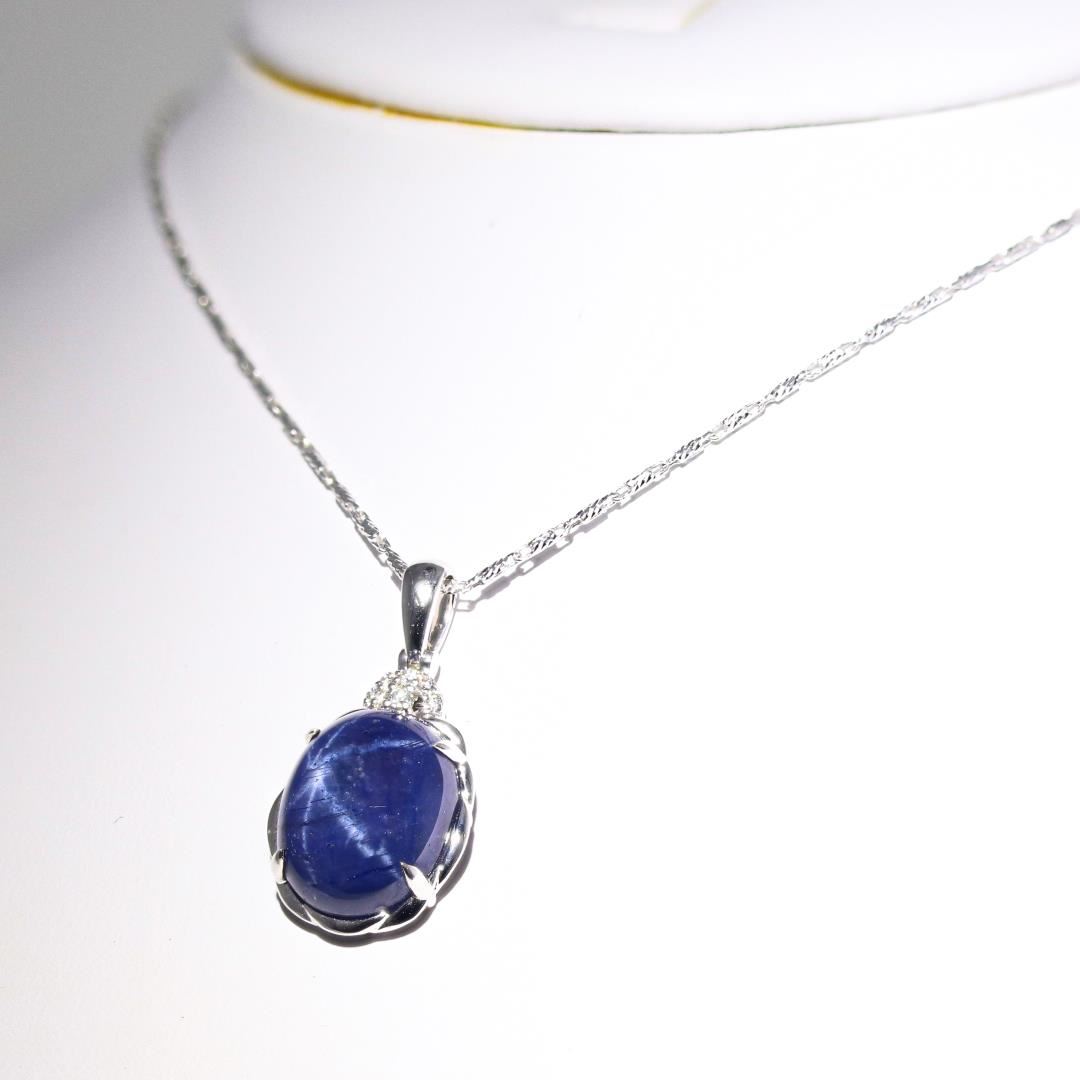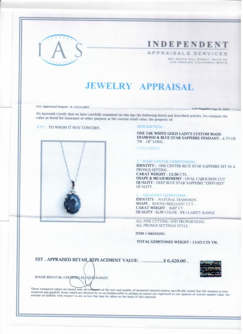 DESCRIPTION : ONE 14K WHITE GOLD LADY'S CUSTOM MADE DIAMOND & BLUE STAR SAPPHIRE PENDANT . 4.70 GR TW. 18" LONG #1 - MAIN CENTER GEMSTONES) :# IDENTITY : ONE CENTER BLUE STAR SAPPHIRE SET IN 4 PRONGS SETTING CARAT WEIGHT : 13.56 CTS SHAPE & MEASUREMEMT : OVAL CABOCHON CUT QUALITY : DEEP BLUE STAR SAPPHIRE "DIFFUSED" QUALITY #2 - ADJACENT GEMSTONES :# IDENTITY : NATURAL DIAMONDS SHAPE : ROUND BRILLIANT CUT CARAT WEIGHT : 0.07 CT QUALITY : G/H COLOR , VS CLARITY RANGE ALL FINE CUTTING AND PROPORTIONS ALL PRONGS SETTINGS STYLE TOTAL GEMSTONES WEIGHT : 13.63 CTS TW. Size: 18