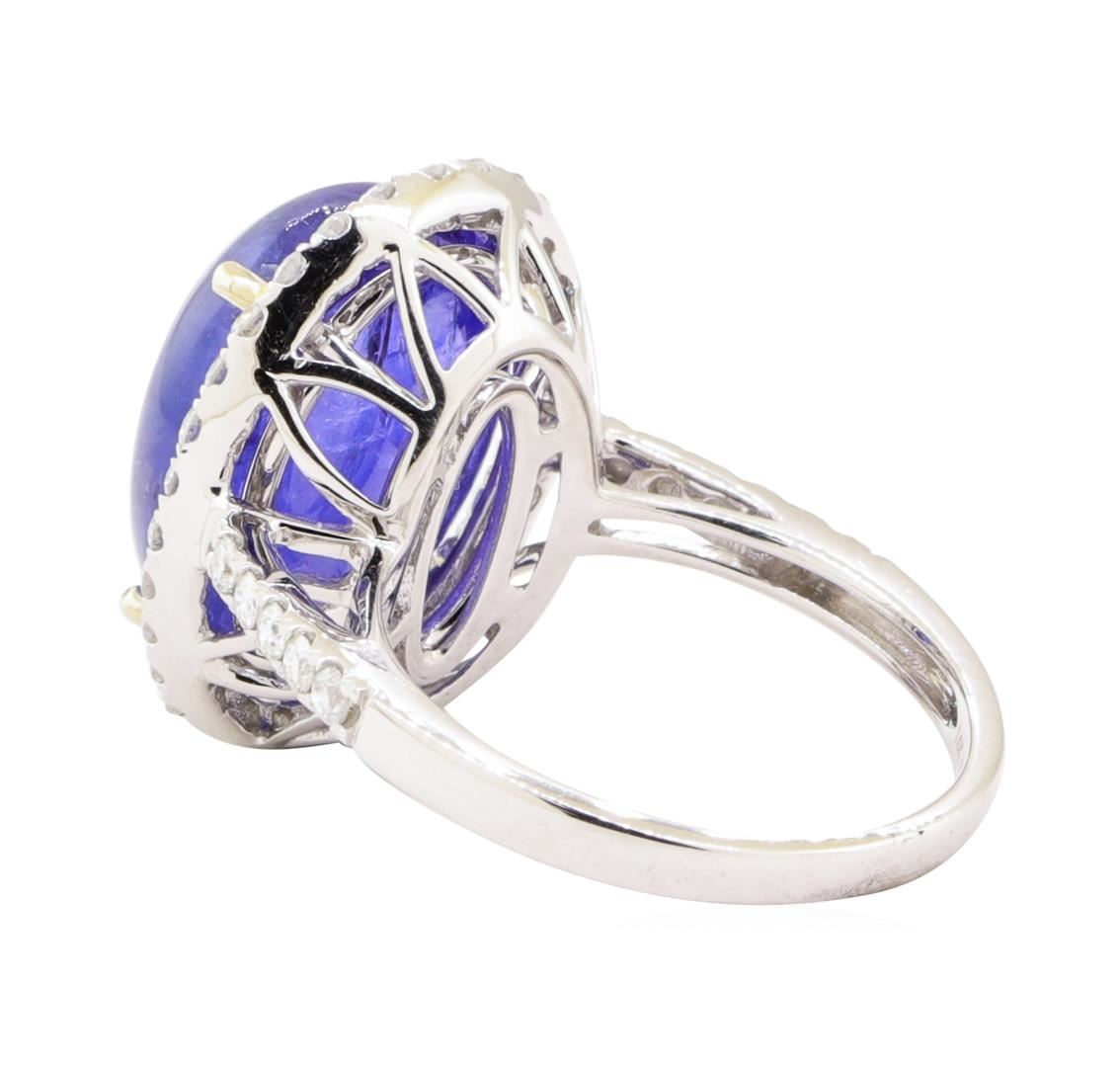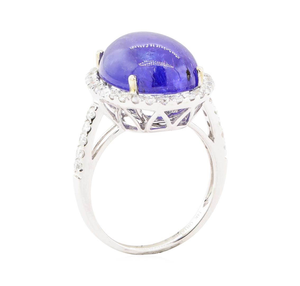 One electronically tested 14KT white gold lady's cast fashion halo ring with a cathedral shank with a bright polish finish. Trademark is Orianne. Identified with markings of '14K'. Condition is new, good workmanship. Containing: One prong set oval cabochon standard cut natural tanzanite, measuring 15.60 x 12.35 x 7.10mm, (depth est.) 3%. bulge factor, approximate weight of 12.75ct., clarity is moderately included, medium, strong, violetish blue color, (GIA vB 5/5), cut is very good. Colored gemstones are presumed to have been subjected to commonly used enhancement processes. Transmitting light somewhat diffusely, transparent to translucent. Graded in the setting. Forty prong set round brilliant cut diamonds, measuring 1.80 - 1.75 x 1.10mm (depth est.) approximate total weight of 40 Stones = 0.85ct. Graded in the setting. Color G - H Clarity SI-1 to I-1 Cut Very Good. Total Weight of Colored Stones 12.75ct.. Total Weight of Diamonds 0.85ct.. Total Weight of Ring 7.00gm GAS Appraised at $8745.00. GAS Appraised.