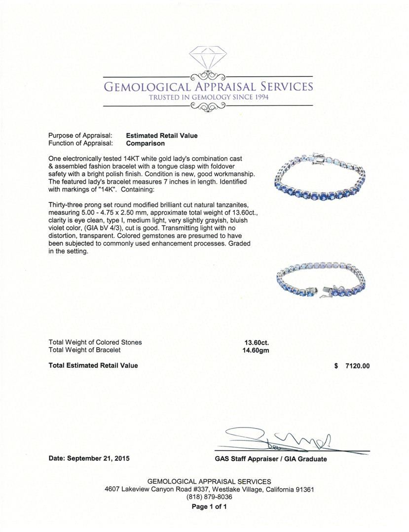 One electronically tested 14KT white gold lady's combination cast & assembled fashion bracelet with a tongue clasp with foldover safety with a bright polish finish. The featured lady's bracelet measures 7 inches in length. Identified with markings of "14K". Condition is new, good workmanship. Containing: Thirty-three prong set round modified brilliant cut natural tanzanites, measuring 5.00 - 4.75 x 2.50 mm, approximate total weight of 13.60ct., clarity is eye clean, type I, medium light, very slightly grayish, bluish violet color, (GIA bV 4/3), cut is good. Transmitting light with no distortion, transparent. Colored gemstones are presumed to have been subjected to commonly used enhancement processes. Graded in the setting. Total Weight of Colored Stones 13.60ct. Total Weight of Bracelet 14.60gm at $7120.00.. GAS Appraised at $7,120.00.
