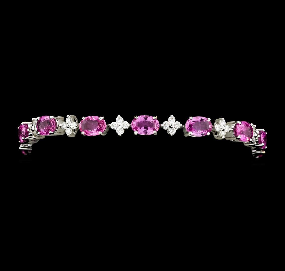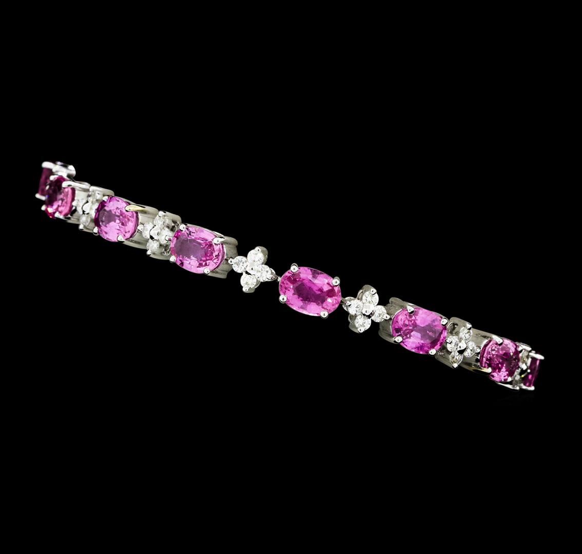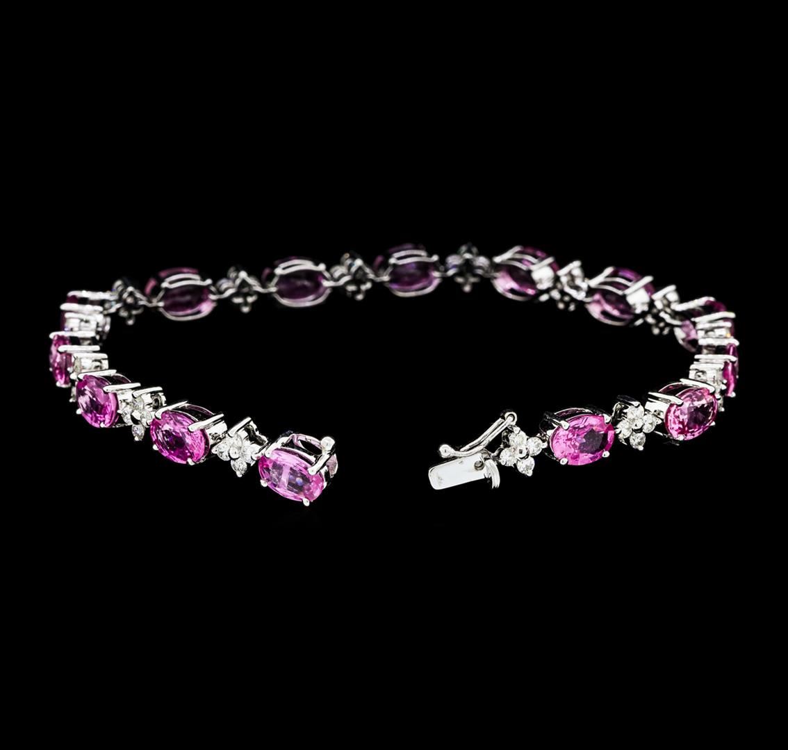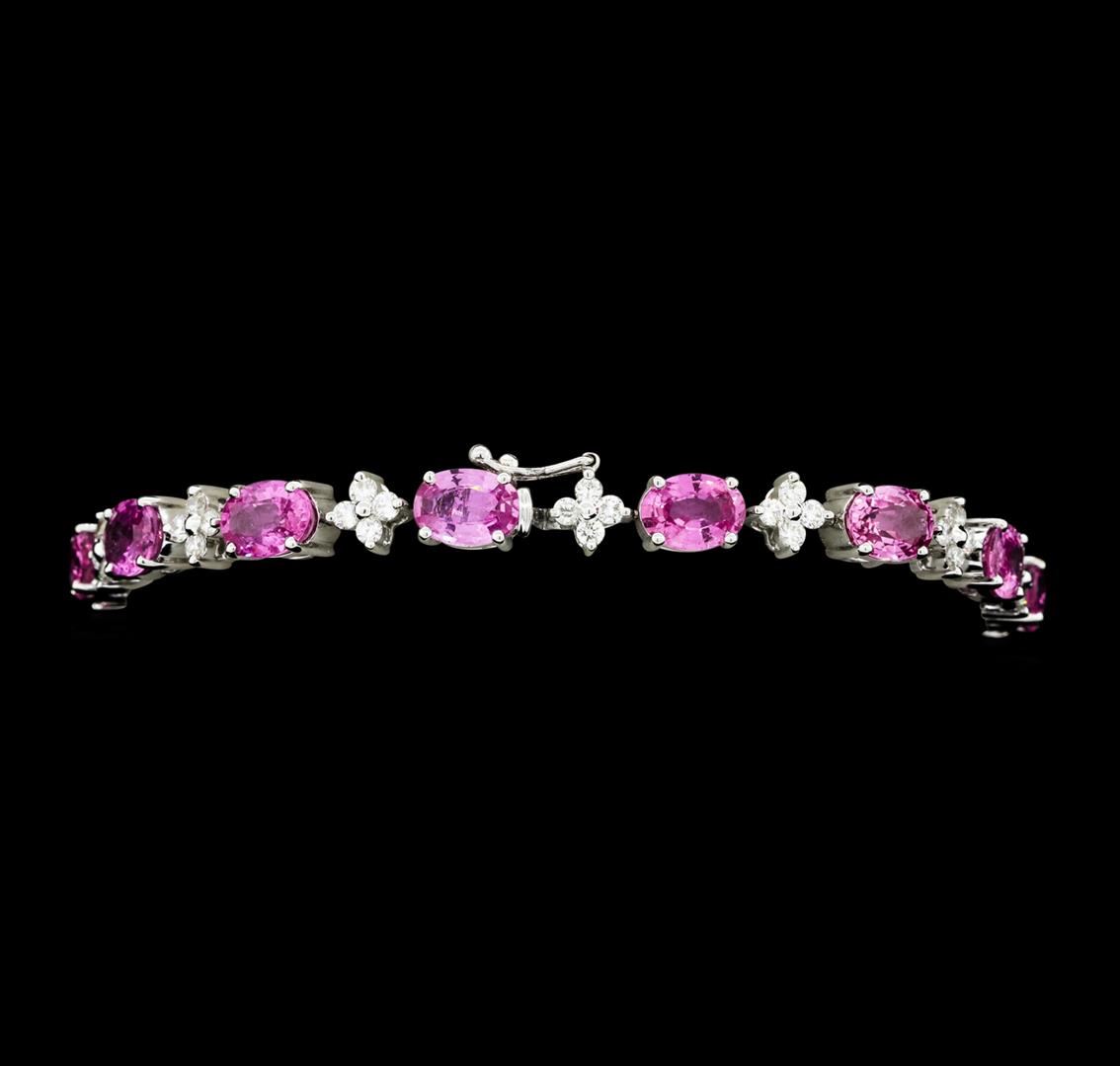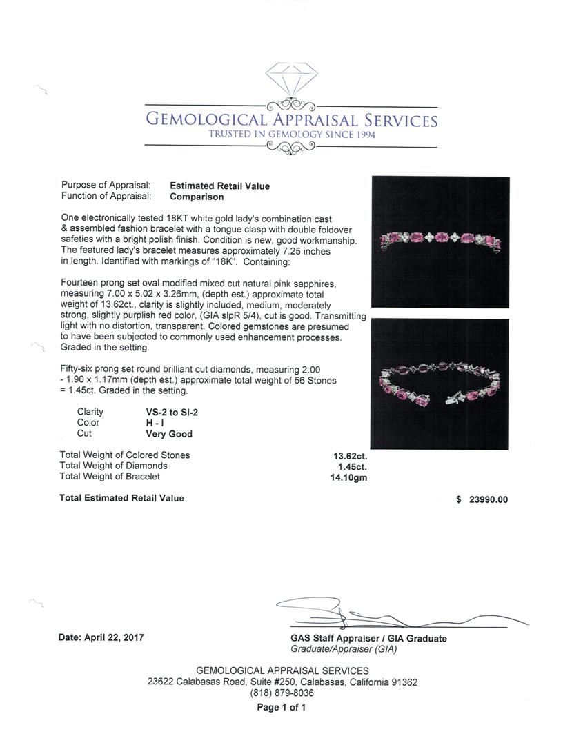 One electronically tested 18KT white gold lady's combination cast & assembled fashion bracelet with a tongue clasp with double foldover safeties with a bright polish finish. The featured lady's bracelet measures approximately 7.25 inches in length. Identified with markings of '18K'. Condition is new, good workmanship. Containing: Fourteen prong set oval modified mixed cut natural pink sapphires, measuring 7.00 x 5.02 x 3.26mm, (depth est.) approximate total weight of 13.62ct., clarity is slightly included, medium, moderately strong, slightly purplish red color, (GIA slpR 5/4), cut is good. Transmitting light with no distortion, transparent. Colored gemstones are presumed to have been subjected to commonly used enhancement processes. Graded in the setting. Fifty-Six prong set round brilliant cut diamonds, measuring 2.00 - 1.90 x 1.17mm (depth est.) approximate total weight of 56 Stones = 1.45ct. Graded in the setting. Color H - I Clarity VS-2 to SI-2 Cut Very Good. Total Weight of Colored Stones 13.62ct.. Total Weight of Diamonds 1.45ct.. Total Weight of Bracelet 14.10gm GAS Appraised at $23990.00. GAS Appraised at $23,990.00.