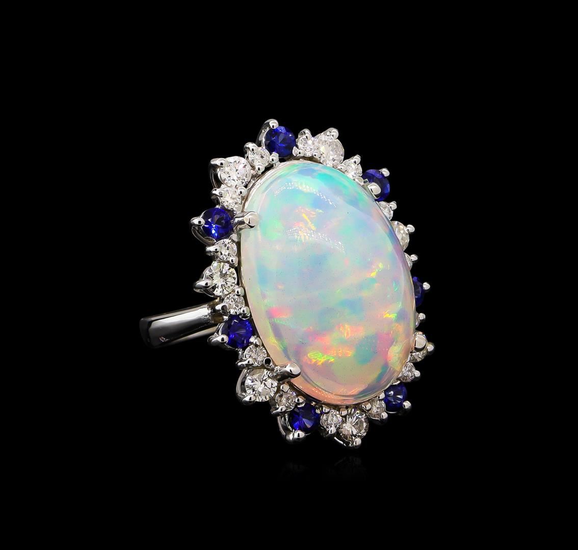 One electronically tested 14KT white gold lady's combination cast & assembled fashion ring with a basket halo with a bright polish finish. The featured lady's ring has a shank measuring 2.97 millimeters wide. Identified with markings of "K14". Condition is new, good workmanship. Containing: One crystal opal that is cut in a oval shaped cabochon and is prong set, measuring 22.65 mm long x 15.87 mm wide, and 8.44 mm thick and the approximate weight is 13.66 carats. The opal has a quite bright, red multicolor play of color (fire) in a rolling flashfire pattern; a high dome; a good cut; no inclusions; consistent in its brightness and pattern; and is not directional. Graded in the setting. Seven prong set round modified brilliant cut natural blue sapphires, measuring 2.90 - 2.85 x 1.87 mm, approximate total weight of 0.90ct., clarity is eye clean, type II, medium dark, moderately strong, blue color, (GIA B 6/4), cut is very good. Transmitting light with no distortion, transparent. Colored gemstones are presumed to have been subjected to commonly used enhancement processes. Graded in the setting. Seven prong set round brilliant cut diamonds, measuring 3.00 - 2.90 x 1.83mm (depth est.) approximate total weight of 7 Stones = 0.70ct. Graded in the setting. Clarity: SI-1 to SI-2. Color: H - I. Cut Good Fourteen prong set round brilliant cut diamonds, measuring 2.00 - 1.90 x 1.21mm (depth est.) approximate total weight of 14 Stones = 0.40ct. Graded in the setting. Clarity: SI-1 to SI-2. Color: H - I. Cut Good. Total Weight of Colored Stones 0.90ct. Total Weight of Diamonds 1.10ct. Total Weight of Opals 13.66ct. Total Weight of Ring 12.00gm. GAS Appraised at $16,460.00.