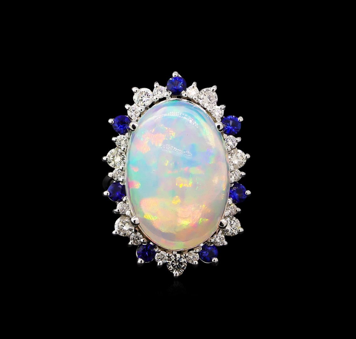One electronically tested 14KT white gold lady's combination cast & assembled fashion ring with a basket halo with a bright polish finish. The featured lady's ring has a shank measuring 2.97 millimeters wide. Identified with markings of "K14". Condition is new, good workmanship. Containing: One crystal opal that is cut in a oval shaped cabochon and is prong set, measuring 22.65 mm long x 15.87 mm wide, and 8.44 mm thick and the approximate weight is 13.66 carats. The opal has a quite bright, red multicolor play of color (fire) in a rolling flashfire pattern; a high dome; a good cut; no inclusions; consistent in its brightness and pattern; and is not directional. Graded in the setting. Seven prong set round modified brilliant cut natural blue sapphires, measuring 2.90 - 2.85 x 1.87 mm, approximate total weight of 0.90ct., clarity is eye clean, type II, medium dark, moderately strong, blue color, (GIA B 6/4), cut is very good. Transmitting light with no distortion, transparent. Colored gemstones are presumed to have been subjected to commonly used enhancement processes. Graded in the setting. Seven prong set round brilliant cut diamonds, measuring 3.00 - 2.90 x 1.83mm (depth est.) approximate total weight of 7 Stones = 0.70ct. Graded in the setting. Clarity: SI-1 to SI-2. Color: H - I. Cut Good Fourteen prong set round brilliant cut diamonds, measuring 2.00 - 1.90 x 1.21mm (depth est.) approximate total weight of 14 Stones = 0.40ct. Graded in the setting. Clarity: SI-1 to SI-2. Color: H - I. Cut Good. Total Weight of Colored Stones 0.90ct. Total Weight of Diamonds 1.10ct. Total Weight of Opals 13.66ct. Total Weight of Ring 12.00gm. GAS Appraised at $16,460.00.