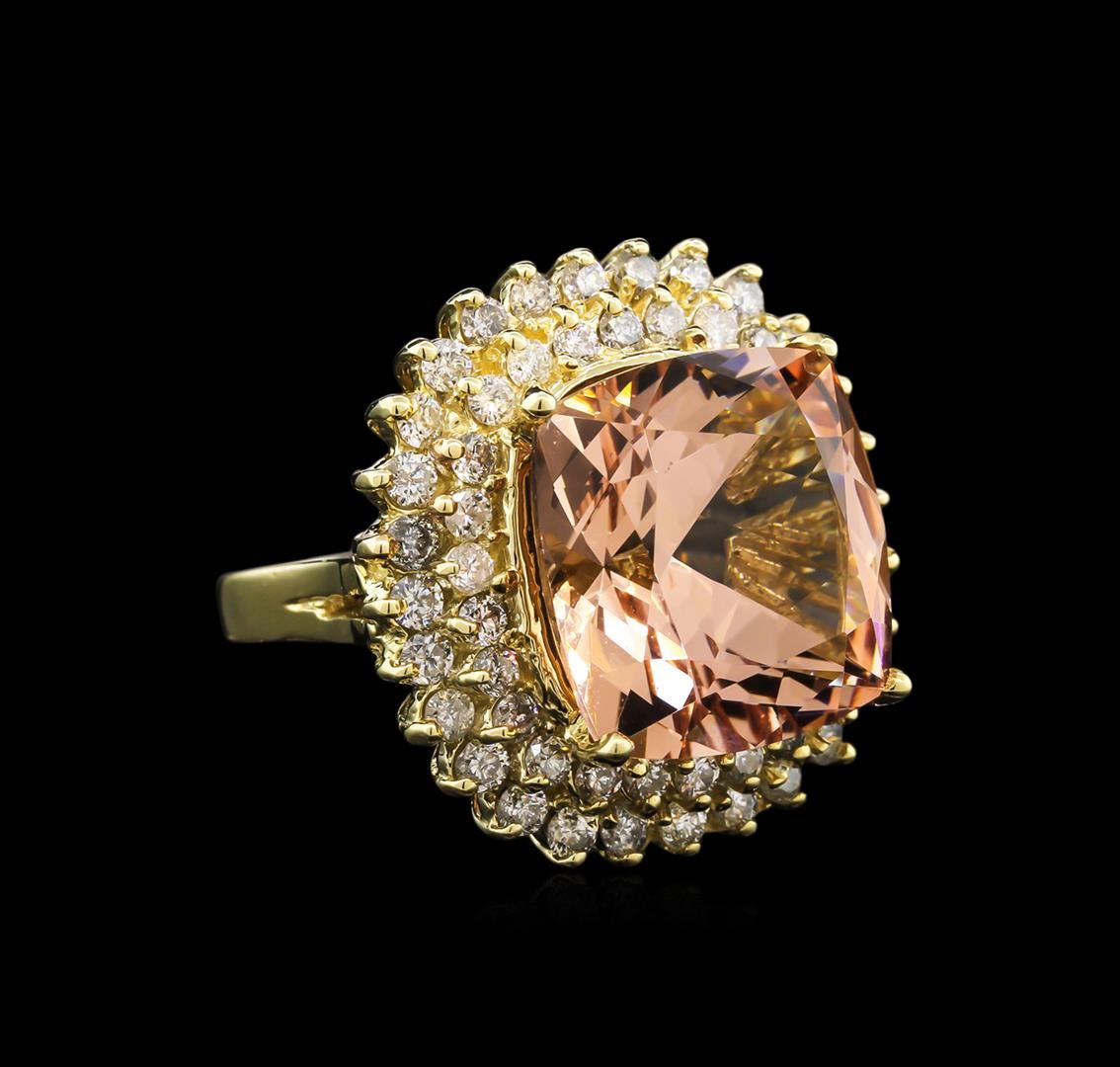 One electronically tested 14KT yellow gold lady's cast fashion ring with a double basket halo with a bright polish finish. The featured lady's ring has a shank measuring 1.93 millimeters wide. Identified with markings of "14K". Condition is new, good workmanship. Containing: One prong set square cushion modified brilliant cut natural morganite, measuring 15.10 x 15.09 x 10.08mm, approximate weight of 13.71ct., clarity is eye clean, type I, light, very slightly brownish, reddish orange color, (GIA rO 3/3), cut is very good. Transmitting light with no distortion, transparent. Colored gemstones are presumed to have been subjected to commonly used enhancement processes. Graded in the setting. Fifty-Four prong set round brilliant cut diamonds, measuring 2.10 - 2.00 x 1.33mm (depth est.) approximate total weight of 54 Stones = 1.85ct. Graded in the setting. Clarity: SI-2 to I-1. Color: H - Good. Total Weight of Colored Stones 13.71ct. Total Weight of Diamonds 1.85ct. Total Weight of Ring 14.90gm. GAS Appraised at $8,530.00.