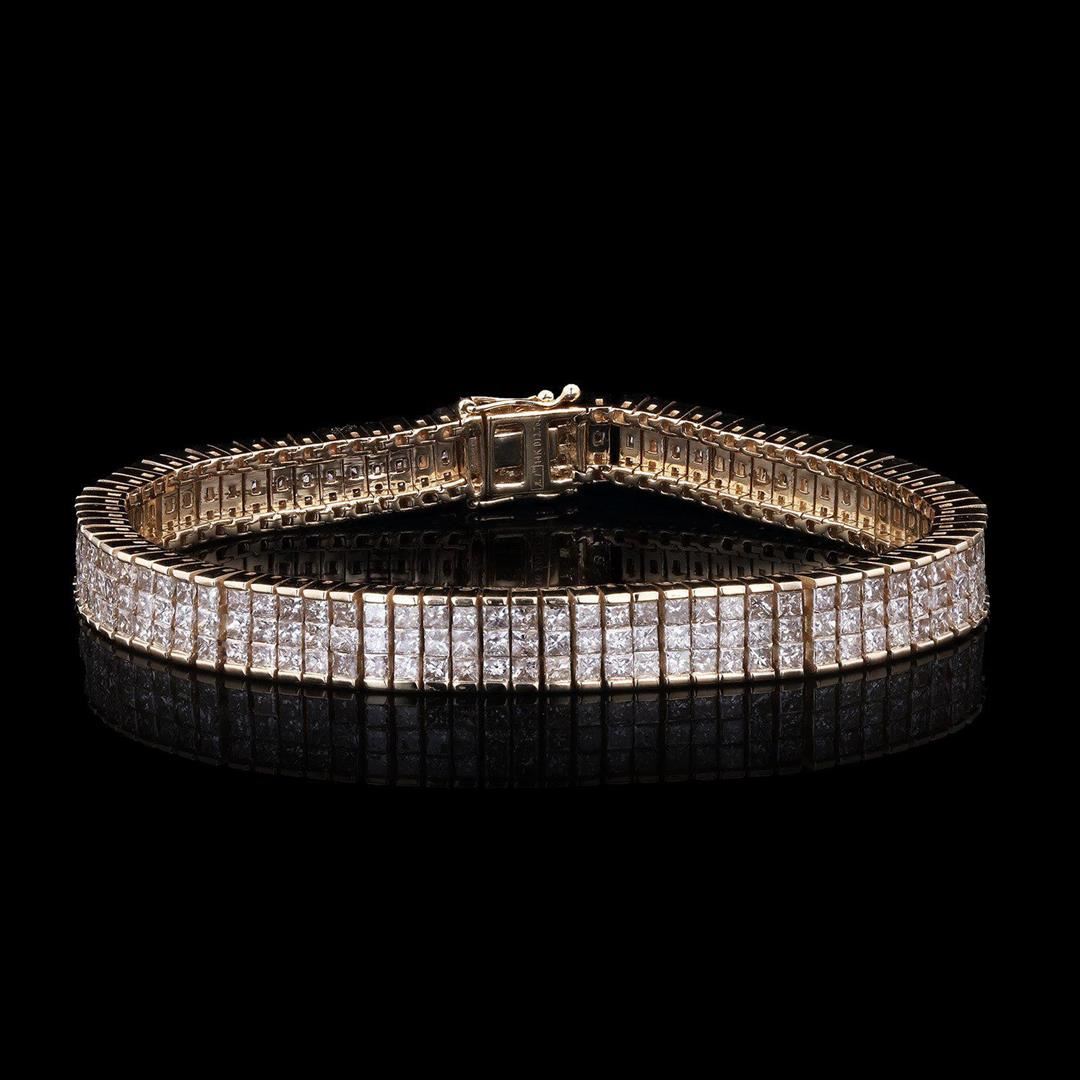 13.76ctw Diamond 14K Yellow Gold Tennis Bracelet. One electronically tested 14KT yellow gold ladies cast and assembled diamond tennis bracelet. Seven and three-quarter inch length bracelet composed of a flexible ribbon of diamonds, terminating in a concealed clasp with twin safeties. Identified with markings of "14K". Condition is new, good workmanship. Bright polish finish. Tennis bracelets and necklaces got their unusual name from an incident involving the U.S. professional tennis player Chris Evert during a tennis match in the 1980's. Evert had been wearing an expensive diamond bracelet, an inline string of individually-set diamonds. Previously these bracelets were known as eternity bracelets. When the clasp snapped during play, she asked the officials to stop the tennis match until the bracelet could be found. Since that day, bracelets and necklaces featuring an inline string of diamonds have been called tennis bracelets and tennis necklaces. Containing: Two hundred fifty-eight invisible set princess cut diamonds, measuring 2.10mm x 1.90mm x 1.43mm (depth est.) approximate total weight of 258 Stones = 13.76ct. Graded in the setting. Clarity SI2 to I2 Color G - I Total Weight of Diamonds 13.76ct. Total Weight of Bracelet 41.22 gm