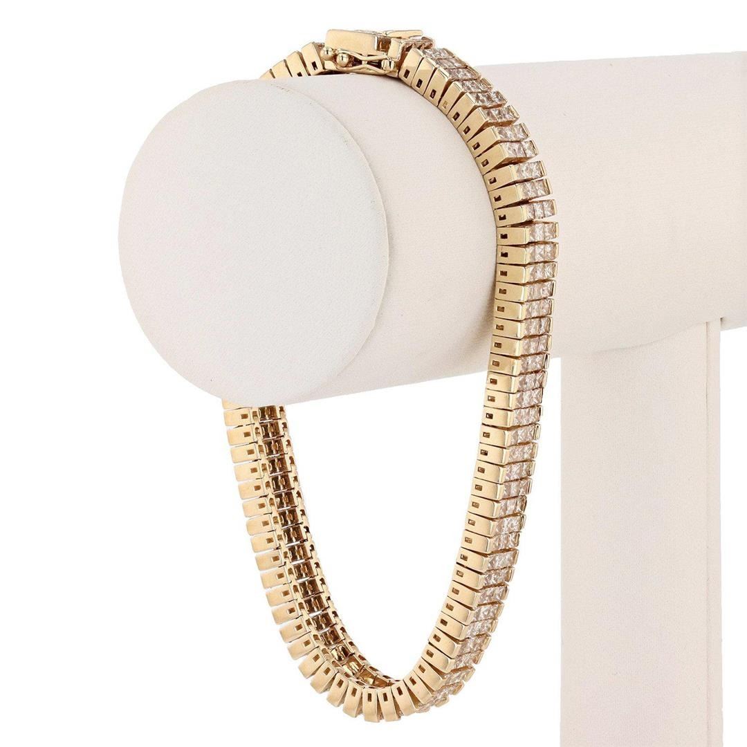 13.76ctw Diamond 14K Yellow Gold Tennis Bracelet. One electronically tested 14KT yellow gold ladies cast and assembled diamond tennis bracelet. Seven and three-quarter inch length bracelet composed of a flexible ribbon of diamonds, terminating in a concealed clasp with twin safeties. Identified with markings of "14K". Condition is new, good workmanship. Bright polish finish. Tennis bracelets and necklaces got their unusual name from an incident involving the U.S. professional tennis player Chris Evert during a tennis match in the 1980's. Evert had been wearing an expensive diamond bracelet, an inline string of individually-set diamonds. Previously these bracelets were known as eternity bracelets. When the clasp snapped during play, she asked the officials to stop the tennis match until the bracelet could be found. Since that day, bracelets and necklaces featuring an inline string of diamonds have been called tennis bracelets and tennis necklaces. Containing: Two hundred fifty-eight invisible set princess cut diamonds, measuring 2.10mm x 1.90mm x 1.43mm (depth est.) approximate total weight of 258 Stones = 13.76ct. Graded in the setting. Clarity SI2 to I2 Color G - I Total Weight of Diamonds 13.76ct. Total Weight of Bracelet 41.22 gm