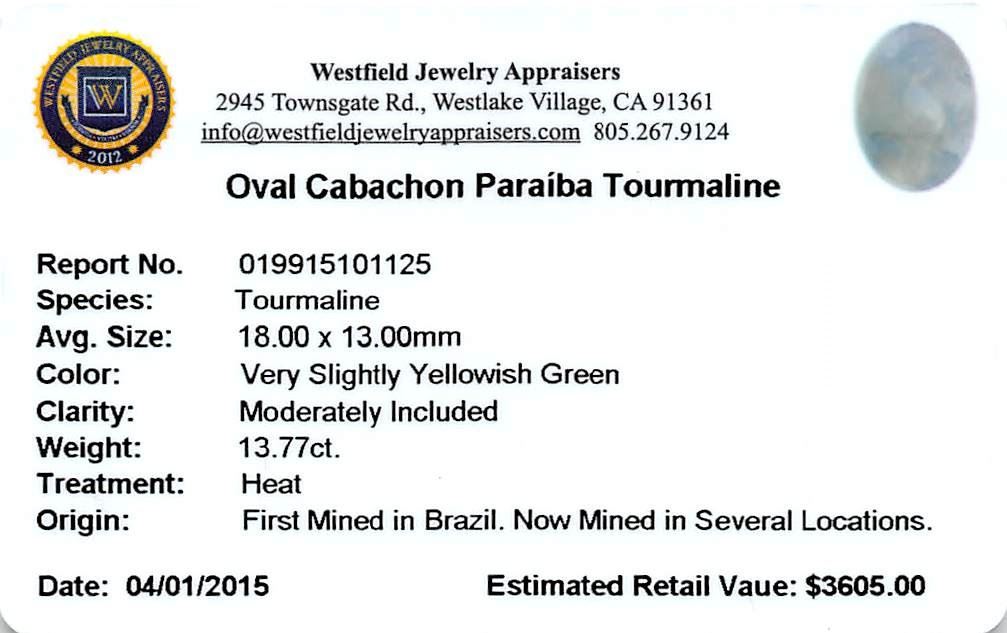 One oval cabochon cut natural Paraiba tourmaline exact weight 13.77ct., clarity is moderately included, cut is good. Westfield Appraised at $3,605.00.