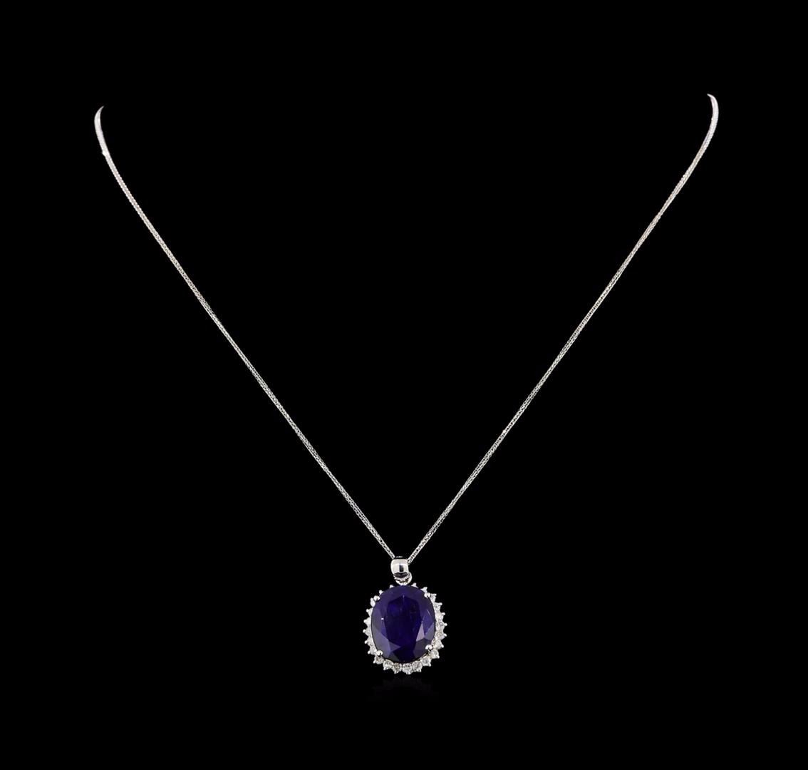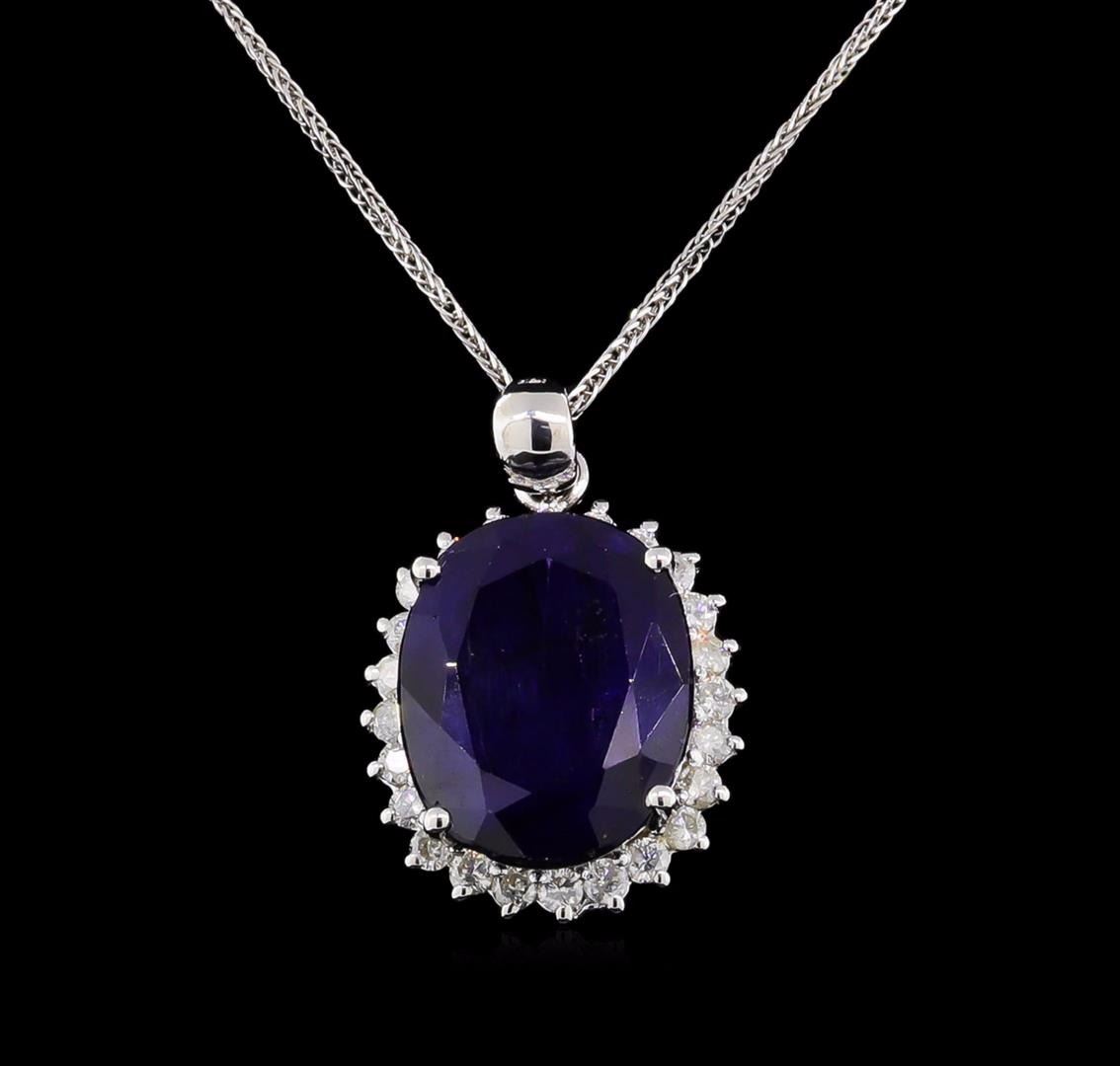 14K Gold Sapphire & Diamond Pendant. One polished, stamped, and tested 14K white gold pendant mounted with: 1 faceted sapphire center stone weighing 13.79 carat, and 24 faceted round diamonds weighing 0.74 carats. The pendant hangs on a 14K white gold link chain measuring 18 inches in length. This item weighs 7.4 grams, condition is new, excellent workmanship. Main gemstone: Species: Natural Corundum. Variety: Sapphire. Shape: Oval. Cutting style: Brilliant cut crown step cut pavilion. Measurements: 16.1 x 12.9 x 8.1 mm. Weight: 13.79 carat. Color: Blue. Cut grade: Very good. Treatment: heat. Refractive index: 1.762-1.770 DR. Birefringence: 0.008-0.010. Hardness: 9. Adjacent gemstones on pendant: Identity: Natural diamond. Shape: Round. Cutting style: Brilliant cut. Quantity: 24 diamonds. Measurements: 2.0 mm. Total weight: 0.74 carats. Clarity grade: SI2-SI3. Color grade: H-I. Refractive index: 2.418. Hardness: 10. AIGL Appraised at $6,387.00.