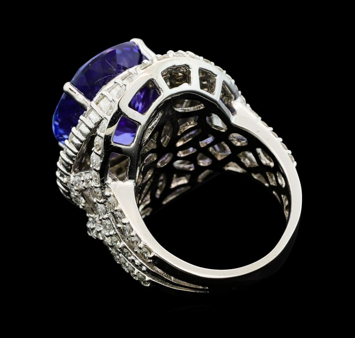 One electronically tested 14KT white gold lady's cast fashion ring with a splite shank double basket halo with a bright polish finish. Condition is new, good workmanship. The featured lady's ring has a shank measuring 4.10 millimeters wide, Identified with markings of "K14". Containing: One prong set oval modified brilliant cut natural tanzanite, measuring 16.19 x 13.93 X 8.67mm, (depth est.) approximate weight of 13.82ct., clarity is eye clean, medium, very slightly grayish, violetish blue color, (GIA vB 5/3), cut is very good. Transmitting light with no distortion, transparent. Colored gemstones are presumed to have been subjected to commonly used enhancement processes. Graded in the setting. One hundred thirty-six prong set round brilliant cut diamonds, measuring 1.90 - 1.80 x 1.15mm (depth est.) approximate total weight of 136 Stones = 3.26ct. Graded in the setting. Clarity SI-1 to SI-2 Color G - I Cut Good Two prong set round brilliant cut diamonds, measuring 1.40 - 1.30 x 0.84mm (depth est.) approximate total weight of 2 Stones = 0.02ct Graded in the setting. Clarity SI-1 to SI Color G - I Cut Good Total Weight of Colored Stones 13.82ct. Total Weight of Diamonds 3.28ct. Total Weight of Ring 17.30gm Total Estimated Retail Value $ 28070.00 GAS Appraised.