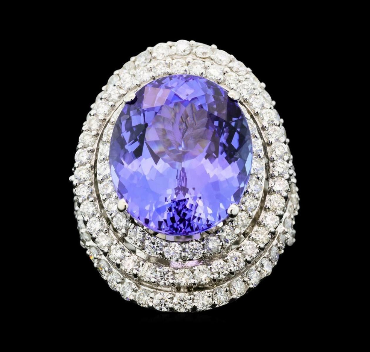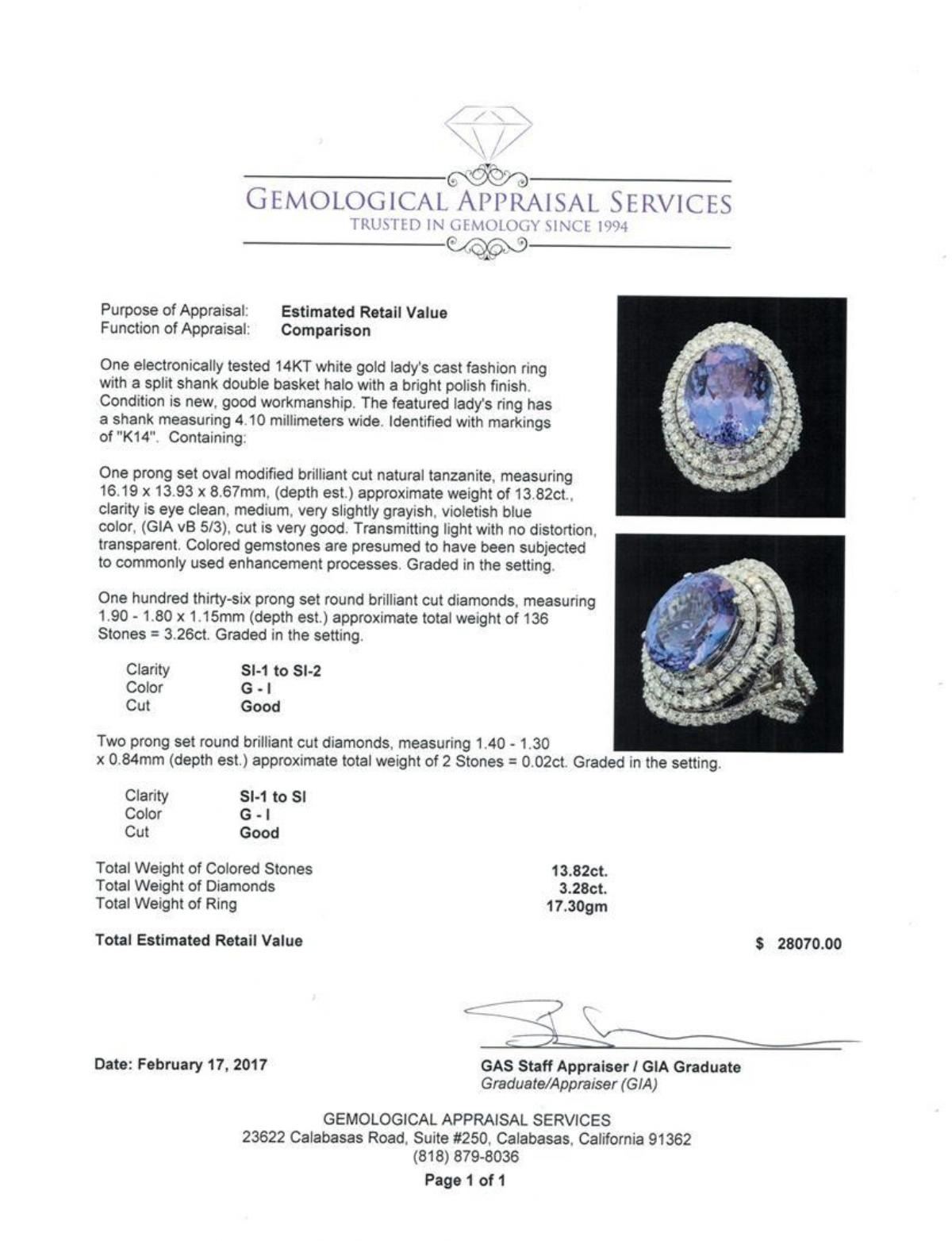 One electronically tested 14KT white gold lady's cast fashion ring with a splite shank double basket halo with a bright polish finish. Condition is new, good workmanship. The featured lady's ring has a shank measuring 4.10 millimeters wide, Identified with markings of "K14". Containing: One prong set oval modified brilliant cut natural tanzanite, measuring 16.19 x 13.93 X 8.67mm, (depth est.) approximate weight of 13.82ct., clarity is eye clean, medium, very slightly grayish, violetish blue color, (GIA vB 5/3), cut is very good. Transmitting light with no distortion, transparent. Colored gemstones are presumed to have been subjected to commonly used enhancement processes. Graded in the setting. One hundred thirty-six prong set round brilliant cut diamonds, measuring 1.90 - 1.80 x 1.15mm (depth est.) approximate total weight of 136 Stones = 3.26ct. Graded in the setting. Clarity SI-1 to SI-2 Color G - I Cut Good Two prong set round brilliant cut diamonds, measuring 1.40 - 1.30 x 0.84mm (depth est.) approximate total weight of 2 Stones = 0.02ct Graded in the setting. Clarity SI-1 to SI Color G - I Cut Good Total Weight of Colored Stones 13.82ct. Total Weight of Diamonds 3.28ct. Total Weight of Ring 17.30gm Total Estimated Retail Value $ 28070.00 GAS Appraised.