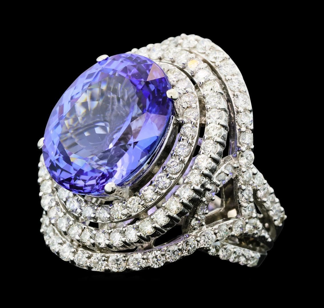 One electronically tested 14KT white gold lady's cast fashion ring with a splite shank double basket halo with a bright polish finish. Condition is new, good workmanship. The featured lady's ring has a shank measuring 4.10 millimeters wide, Identified with markings of "K14". Containing: One prong set oval modified brilliant cut natural tanzanite, measuring 16.19 x 13.93 X 8.67mm, (depth est.) approximate weight of 13.82ct., clarity is eye clean, medium, very slightly grayish, violetish blue color, (GIA vB 5/3), cut is very good. Transmitting light with no distortion, transparent. Colored gemstones are presumed to have been subjected to commonly used enhancement processes. Graded in the setting. One hundred thirty-six prong set round brilliant cut diamonds, measuring 1.90 - 1.80 x 1.15mm (depth est.) approximate total weight of 136 Stones = 3.26ct. Graded in the setting. Clarity SI-1 to SI-2 Color G - I Cut Good Two prong set round brilliant cut diamonds, measuring 1.40 - 1.30 x 0.84mm (depth est.) approximate total weight of 2 Stones = 0.02ct Graded in the setting. Clarity SI-1 to SI Color G - I Cut Good Total Weight of Colored Stones 13.82ct. Total Weight of Diamonds 3.28ct. Total Weight of Ring 17.30gm Total Estimated Retail Value $ 28070.00 GAS Appraised.
