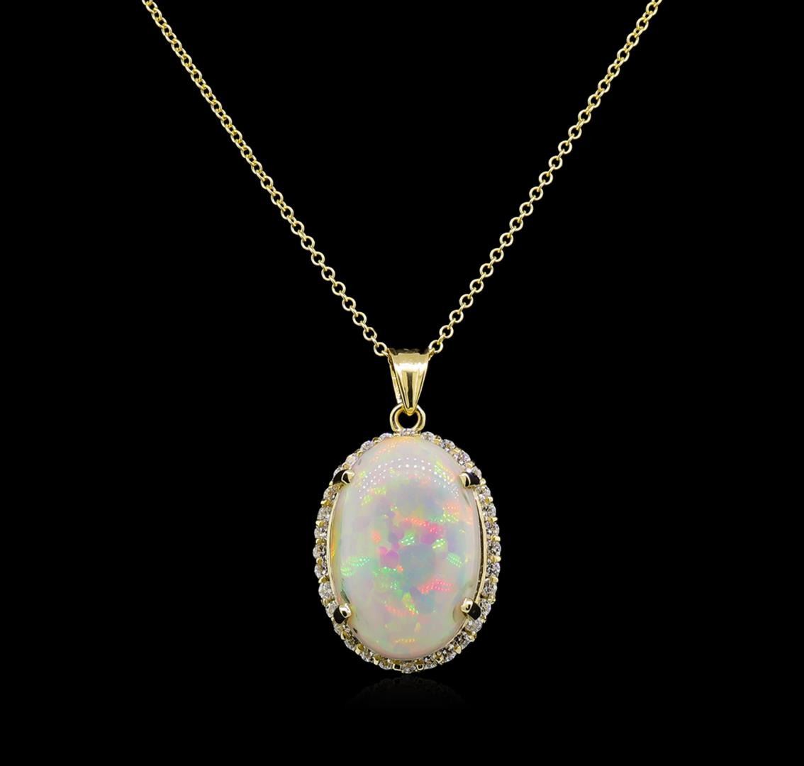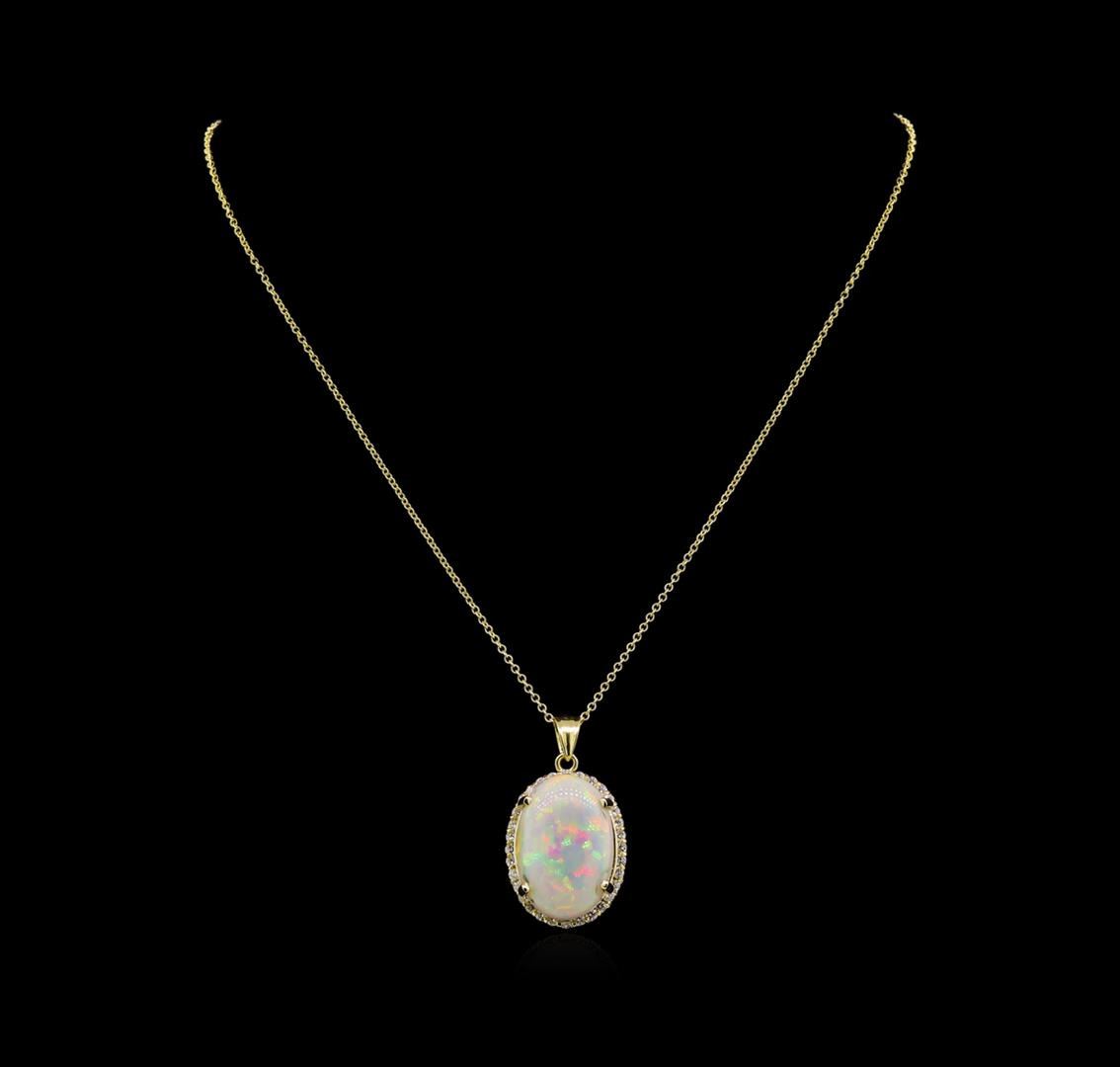 One electronically tested 14KT yellow gold lady's combination cast & assembled fashion pendant & chain 18.0" long, 1.5mm oval cable link with a lobster claw clasp with a bright polish finish. Identified with markings of "14K". Condition is new, good workmanship. Containing: One semi crystal opal that is cut in a oval shaped cabochon and is prong set, measuring 24.87 mm long x 16.55 mm wide, and 6.88 mm thick and the approximate weight is 13.86 carats. The opal has a very bright, red multicolor play of color (fire) in a broad flashfire pattern; a medium dome; a very good cut; no inclusions; consistent in its brightness and pattern; and is not directional. Graded loose prior to setting. Thirty-Two prong set round brilliant cut diamonds, measuring 2.00 - 1.90 x 1.21mm (depth est.) approximate total weight of 32 Stones = 0.90ct. Graded in the setting. Clarity: VS-2 to SI-2. Color: G - I. Cut Good. Total Weight of Diamonds 0.90ct. Total Weight of Opals 13.86ct. Total Weight of Pendant & Chain 9.60gm.
