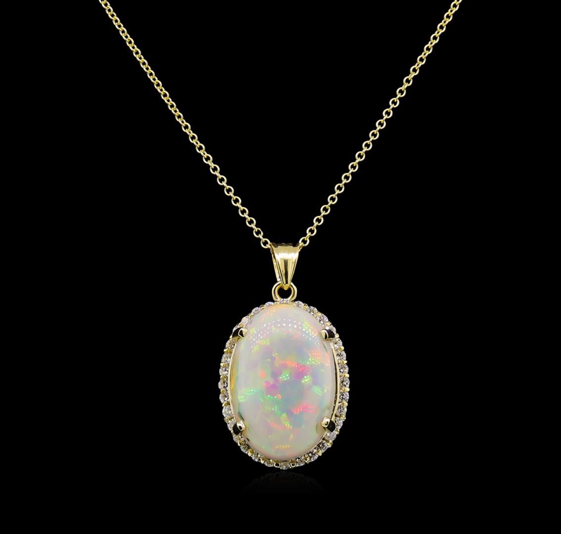 One electronically tested 14KT yellow gold lady's combination cast & assembled fashion pendant & chain 18.0" long, 1.5mm oval cable link with a lobster claw clasp with a bright polish finish. Identified with markings of "14K". Condition is new, good workmanship. Containing: One semi crystal opal that is cut in a oval shaped cabochon and is prong set, measuring 24.87 mm long x 16.55 mm wide, and 6.88 mm thick and the approximate weight is 13.86 carats. The opal has a very bright, red multicolor play of color (fire) in a broad flashfire pattern; a medium dome; a very good cut; no inclusions; consistent in its brightness and pattern; and is not directional. Graded loose prior to setting. Thirty-Two prong set round brilliant cut diamonds, measuring 2.00 - 1.90 x 1.21mm (depth est.) approximate total weight of 32 Stones = 0.90ct. Graded in the setting. Clarity: VS-2 to SI-2. Color: G - I. Cut Good. Total Weight of Diamonds 0.90ct. Total Weight of Opals 13.86ct. Total Weight of Pendant & Chain 9.60gm. GAS Appraised at $11,105.00.