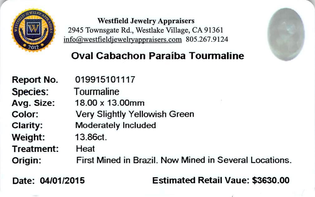 One oval cabochon cut natural Paraiba tourmaline exact weight 13.86ct., clarity is moderately included, cut is good. Westfield Appraised at $3,630.00.