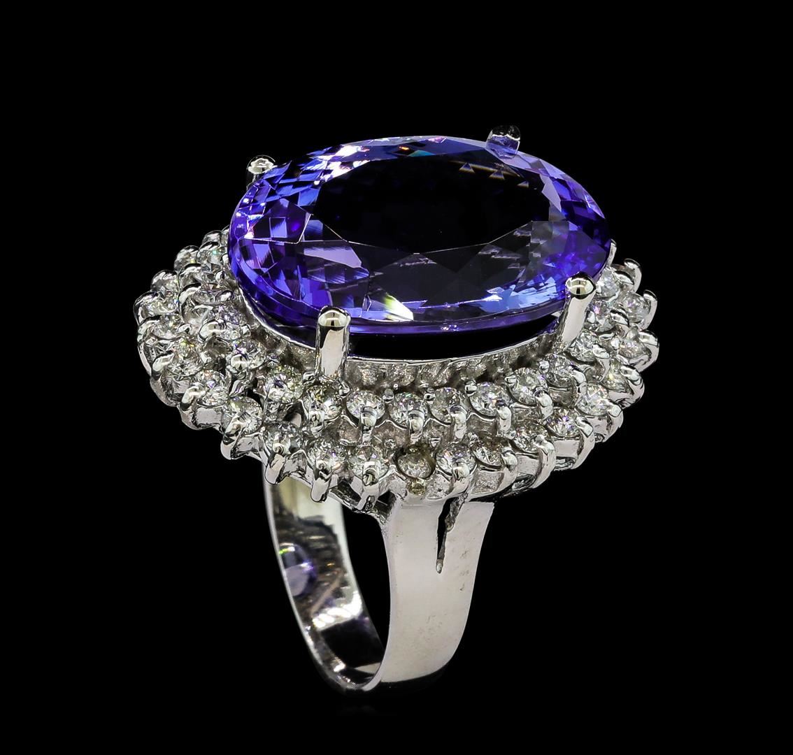 One electronically tested 14KT white gold lady's cast fashion ring with a double basket halo with a bright polish finish. The featured lady's ring has a shank measuring 3.49 millimeters wide. Identified with markings of '14K'. Condition is new, good workmanship. Containing: One prong set oval modified brilliant cut natural tanzanite, measuring 18.06 x 12.67 x 8.14mm, (depth est.) 6%. bulge factor, approximate weight of 13.95ct., clarity is eye clean, medium, very slightly grayish, bluish violet color, (GIA bV 5/3), cut is very good. Transmitting light with no distortion, transparent. Colored gemstones are presumed to have been subjected to commonly used enhancement processes. Graded in the setting. Fifty-Six prong set round brilliant cut diamonds, measuring 1.90 - 1.80 x 1.15mm (depth est.) approximate total weight of 56 Stones = 1.36ct. Graded in the setting. Clarity SI-1 to I-1. Color: G - H Cut Good. Total Weight of Colored Stones 13.95ct.. Total Weight of Diamonds 1.36ct.. Total Weight of Ring 9.20gm. GAS Appraised at $22,590.00.