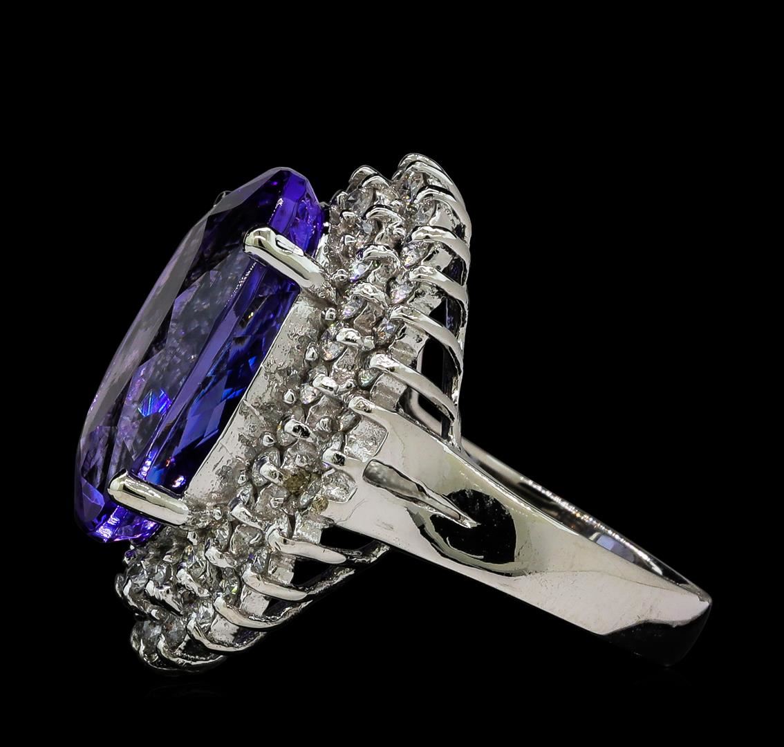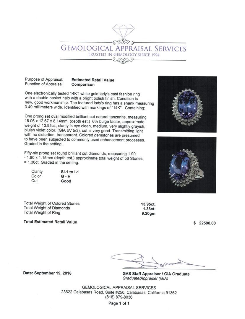 One electronically tested 14KT white gold lady's cast fashion ring with a double basket halo with a bright polish finish. The featured lady's ring has a shank measuring 3.49 millimeters wide. Identified with markings of '14K'. Condition is new, good workmanship. Containing: One prong set oval modified brilliant cut natural tanzanite, measuring 18.06 x 12.67 x 8.14mm, (depth est.) 6%. bulge factor, approximate weight of 13.95ct., clarity is eye clean, medium, very slightly grayish, bluish violet color, (GIA bV 5/3), cut is very good. Transmitting light with no distortion, transparent. Colored gemstones are presumed to have been subjected to commonly used enhancement processes. Graded in the setting. Fifty-Six prong set round brilliant cut diamonds, measuring 1.90 - 1.80 x 1.15mm (depth est.) approximate total weight of 56 Stones = 1.36ct. Graded in the setting. Clarity SI-1 to I-1. Color: G - H Cut Good. Total Weight of Colored Stones 13.95ct.. Total Weight of Diamonds 1.36ct.. Total Weight of Ring 9.20gm. GAS Appraised at $22,590.00.
