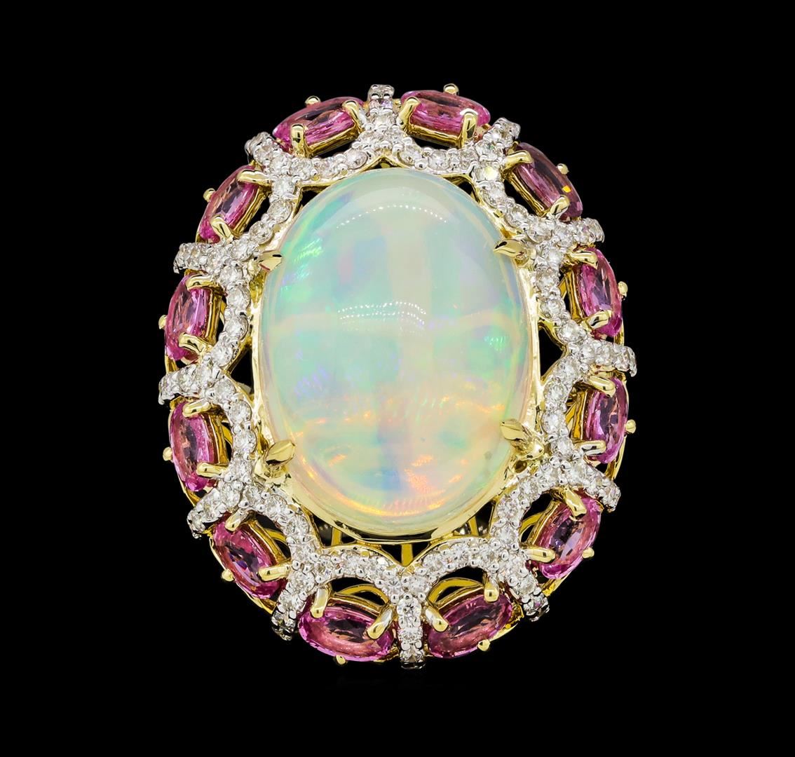 One electronically tested 14KT yellow gold lady's cast fashion ring with a scalloped basket halo with a bright polish finish. The featured lady's ring has a shank measuring 2.83 millimeters wide. Identified with markings of '14K'. Condition is new, good workmanship. Containing: One semi crystal opal that is cut in a oval shaped cabochon and is prong set, measuring 19.70 mm long x 14.66 mm wide, and 8.50 mm thick and the approximate weight is 10.15 carats. The opal has a somewhat bright, multicolor play of color (fire) in a rolling flashfire pattern; a medium dome; a good cut; no inclusions; consistent in its brightness and pattern; and is not directional. The featured opal is Ethiopian in origin. Colored gemstones are presumed to have been subjected to commonly used enhancement processes. Graded in the setting. Twelve prong set oval modified mixed cut natural pink sapphires, measuring 4.80 x 3.00 x 1.95mm, (depth est.) approximate total weight of 2.90ct., clarity is eye clean, medium light, very slightly brownish, slightly purplish red color, (GIA slpR 4/3), cut is good. Transmitting light with no distortion, transparent. Colored gemstones are presumed to have been subjected to commonly used enhancement processes. Graded in the setting. Ninety-Six prong set round brilliant cut diamonds, measuring 1.40 - 1.30 x 0.84mm (depth est.) approximate total weight of 96 Stones = 0.93ct. Graded in the setting. Color G - H Clarity VS-2 to SI-1 Cut Good. Total Weight of Colored Stones 2.90ct.. Total Weight of Diamonds 0.93ct.. Total Weight of Opals 10.15ct.. Total Weight of Ring 12.00gm GAS Appraised at $8225.00. GAS Appraised at $8,225.00.