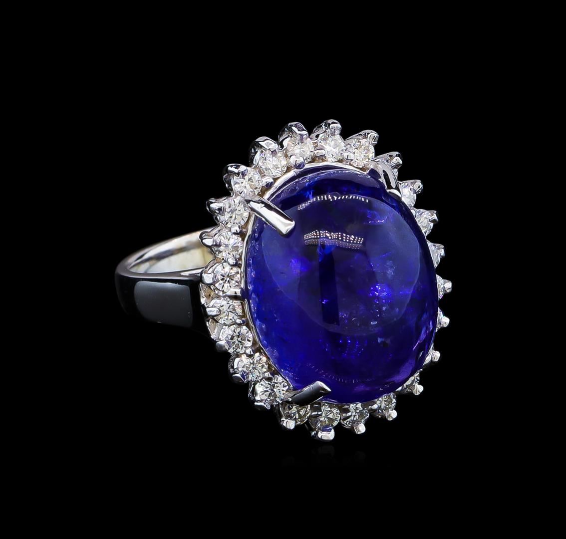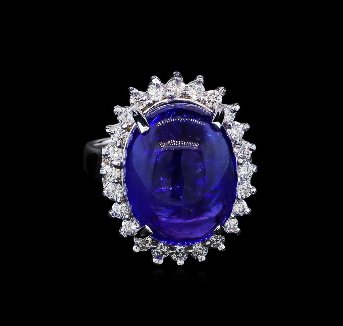 One electronically tested 14KT white gold lady's cast fashion ring with a basket halo with a bright polish finish. The featured lady's ring has a shank measuring 2.63 millimeters in width. Identified with markings of "14K". Condition is new, good workmanship. Containing: One prong set oval cabochon standard cut natural tanzanite, measuring 15.29 x 12.26 x 7.50mm, (depth est.) 10%. bulge factor, approximate weight of 13.98ct., clarity is moderately included, medium dark, moderately strong, violet color, (GIA V 6/4), cut is good. Transmitting light with no distortion, transparent. Colored gemstones are presumed to have been subjected to commonly used enhancement processes. Graded in the setting. Twenty-Four prong set round brilliant cut diamonds, measuring 2.00 - 1.90 x 1.17mm (depth est.) approximate total weight of 24 Stones = 0.64ct. Graded in the setting. Clarity: SI-1 to SI-2. Color: H - I. Cut Good. Total Weight of Colored Stones 13.98ct. Total Weight of Diamonds 0.64ct. Total Weight of Ring 9.40gm. GAS Appraised at $12,925.00.