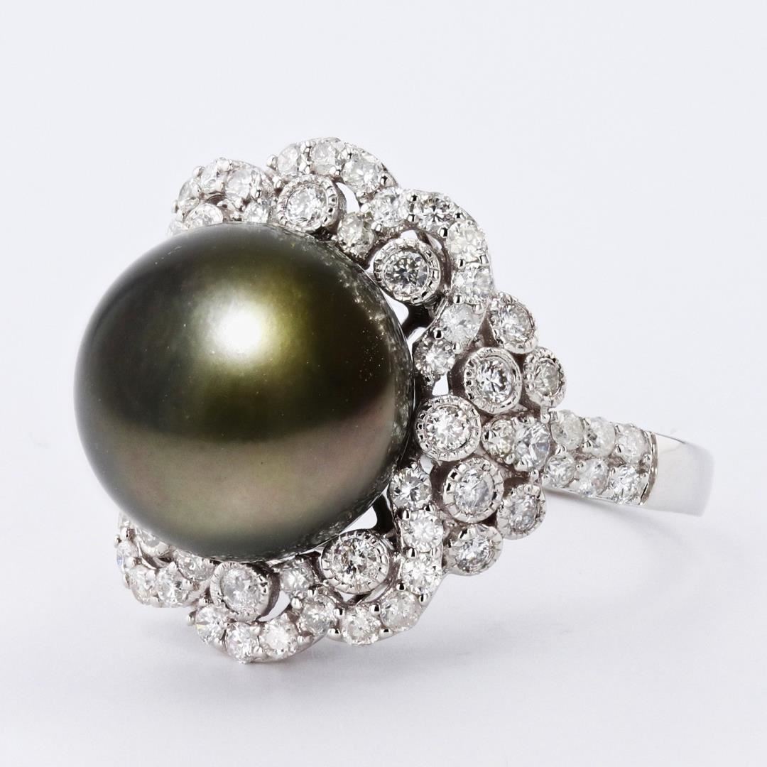 One polished, stamped, and tested 18K white gold ring with a bright finish. The ring is mounted with: 1 genuine cultured Tahitian Pearl, and 70 genuine round diamonds weighing approximately 1.15 carats. This item weighs 7.6 grams, condition is new, excellent workmanship. MAIN GEMSTONE Identity: Tahitian Pearl Species: Cultured Pearl Shape: Round Measurements: 13mm Body Color: Very Dark Gray Overtone: Faint Purplish Pink Luster: Excellent Surface Grade: Clean Refractive Index: 1.530 - 1.685 DR Birefringence: 0.15 Specific Gravity: 2.72 - 2.78 ADJACENT GEMSTONES ON RING Identity: Natural Diamond Shape: Round Cutting Style: Brilliant Cut Quantity: 70 Diamonds Measurements: 1.3 - 1.7mm Total Weight: 1.15 carats Clarity Grade: SI1 to I2 Color Grade: G - I Refractive Index: 2.418 Hardness: 10 TAHITIAN PEARL: 13mm TOTAL DIAMOND WEIGHT: 1.15ctw WEIGHT OF ITEM: 7.6 grams GOLD CONTENT: 18K White Gold Size: 6 1/2