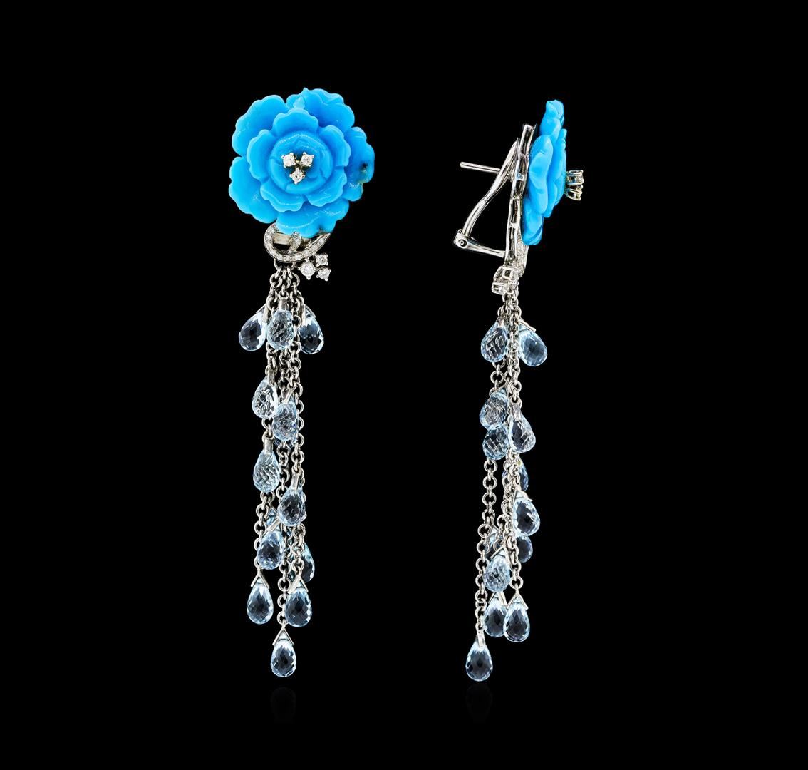 One pair of lady's earrings with omega backs with posts featuring: 18KT white gold weighing 23.2 grams containing diamonds weighing approximately 0.50ctw, two carved rose-shape turquoise and twenty-eight briolette cut blue topazes weighing 14.00ctw.