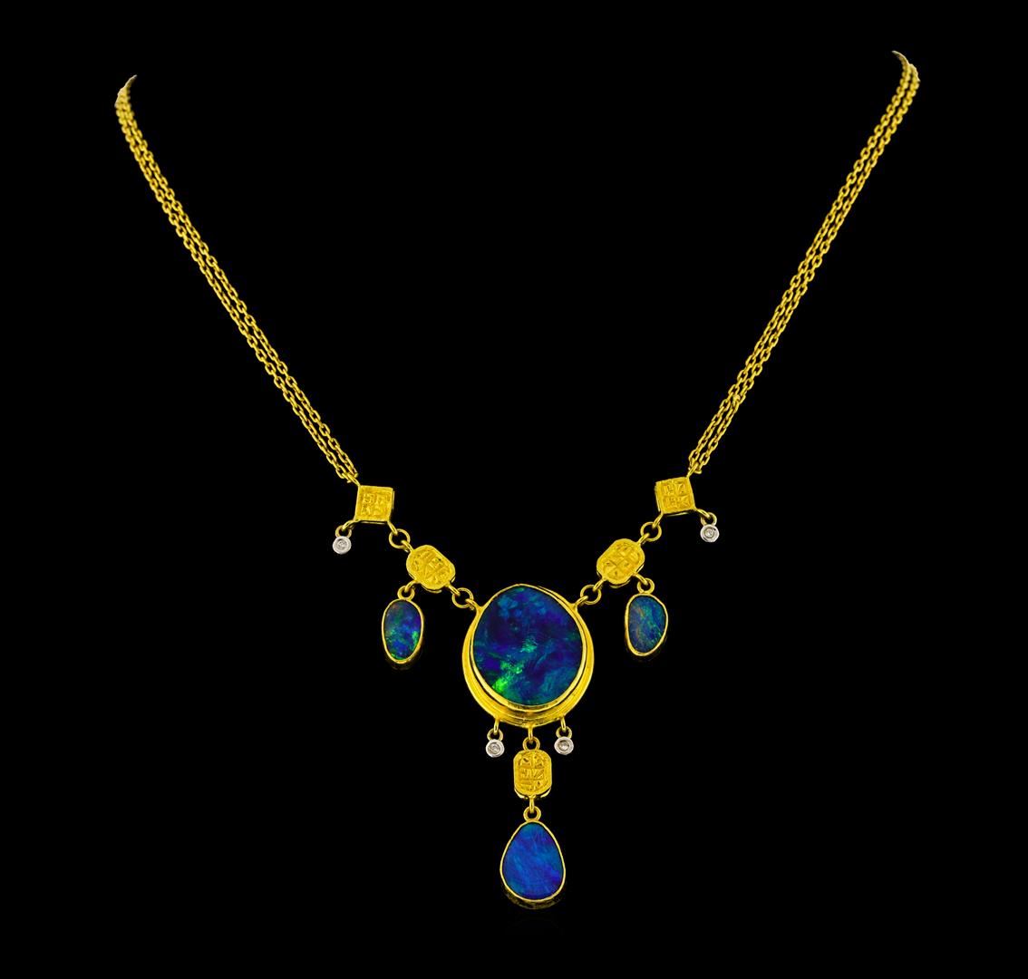 One electronically tested 23KT yellow gold lady's hand fabricated fashion necklace with a toggle clasp with a bright polish and satin finish. The featured lady's necklace has an oval double strand chain measuring approximately 2.50 millimeters wide and approximately 16 inches in length. Identified with markings of '750 / 985K'. Condition is like new, good workmanship. Containing: One boulder black opal that is cut in a free-form shape and is bezel set, measuring 18.00 mm long x 15.00 mm wide, and 2.00 mm thick and the approximate weight is 10.00 carats. The opal has a very bright, blue-green play of color (fire) in a rolling flashfire pattern; a low dome; a good cut; opal is 100%. of face; consistent in its brightness and pattern; and is not directional. Graded in the setting. One boulder black opal that is cut in a free-form shape and is bezel set, measuring 11.40 mm long x 8.15 mm wide, and 2.00 mm thick and the approximate weight is 2.00 carats. The opal has a very bright, blue-green play of color (fire) in a rolling flashfire pattern; a low dome; a good cut; opal is 100%. of face; consistent in its brightness and pattern; and is not directional. Graded in the setting. Two boulder black opals that are cut in a free-form shaped and are bezel set, measuring 8.90 mm long x 5.25 mm wide, and 2.00 mm thick and the approximate weight is 2.00 carats. The opals have a very bright, multicolor play of color (fire) in a rolling flashfire pattern; a low dome; a good cut; opal is 100%. of face; consistent in their brightness and pattern; and are not directional. Graded in the setting. Four bezel set round brilliant cut diamonds, measuring 1.50 - 1.45 x 0.92mm (depth est.) approximate total weight of 4 Stones = 0.05ct. Graded in the setting. Clarity SI-1 to SI-2. Color: G - H Cut Very Good. Total Weight of Diamonds 0.05ct.. Total Weight of Opals 14.00ct.. Total Weight of Necklace 19.80gm. GAS Appraised at $4,660.00.