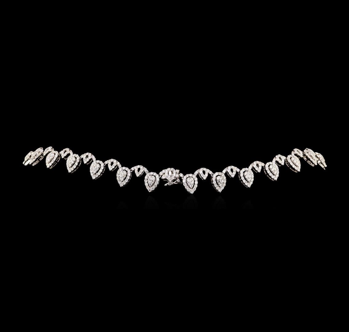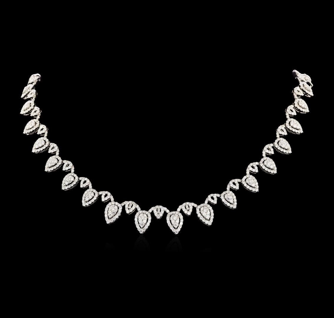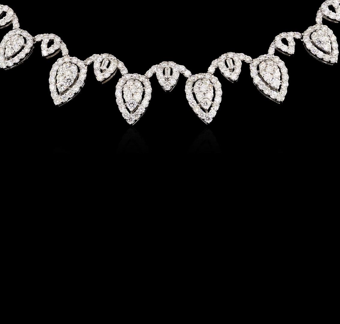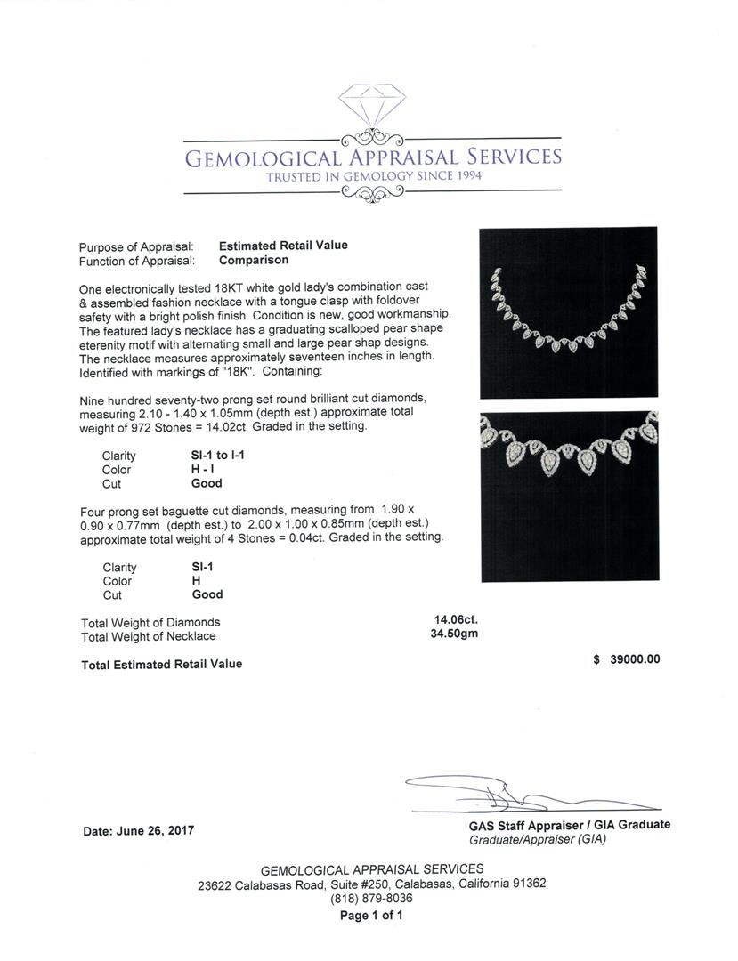 One electronically tested 18KT white gold lady's combination cast & assembled fashion necklace with a tongue clasp with foldover safety with a bright polish finish. The featured lady's necklace has a graduating scalloped pear shape eterenity motif with alternating small and large pear shap designs. The necklace measures approximately seventeen inches in length. Identified with markings of '18K'. Condition is new, good workmanship. Containing: Nine Hundred Seventy-Two prong set round brilliant cut diamonds, measuring 2.10 - 1.40 x 1.05mm (depth est.) approximate total weight of 972 Stones = 14.02ct. Graded in the setting. Color H - I Clarity SI-1 to I-1 Cut Good Four prong set baguette cut diamonds, measuring from 1.90 x 0.90 x 0.77mm (depth est.) to 2.00 x 1.00 x 0.85mm (depth est.) approximate total weight of 4 Stones = 0.04ct. Graded in the setting. Color H Clarity SI-1 Cut Good. Total Weight of Diamonds 14.06ct.. Total Weight of Necklace 34.50gm GAS Appraised at $39000.00. GAS Appraised at $39,000.00.