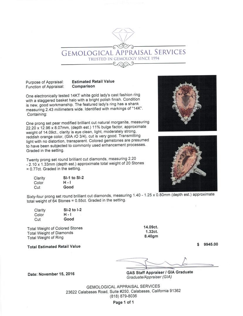One electronically tested 14KT white gold lady's cast fashion ring with a staggered basket halo with a bright polish finish. The featured lady's ring has a shank measuring 2.43 millimeters wide. Identified with markings of '14K'. Condition is new, good workmanship. Containing: One prong set pear modified brilliant cut natural morganite, measuring 22.20 x 12.96 x 8.07mm, (depth est.) 11%. bulge factor, approximate weight of 14.09ct., clarity is eye clean, light, moderately strong, reddish orange color, (GIA rO 3/4), cut is very good. Transmitting light with no distortion, transparent. Colored gemstones are presumed to have been subjected to commonly used enhancement processes. Graded in the setting. Twenty prong set round brilliant cut diamonds, measuring 2.20 - 2.10 x 1.33mm (depth est.) approximate total weight of 20 Stones = 0.77ct. Graded in the setting. Clarity SI-1 to SI-2. Color: H - I Cut Good Sixty-Four prong set round brilliant cut diamonds, measuring 1.40 - 1.25 x 0.80mm (depth est.) approximate total weight of 64 Stones = 0.55ct. Graded in the setting. Clarity SI-2 to I-2. Color: H - I Cut Good. Total Weight of Colored Stones 14.09ct.. Total Weight of Diamonds 1.32ct.. Total Weight of Ring 8.40gm. GAS Appraised at $9,945.00.
