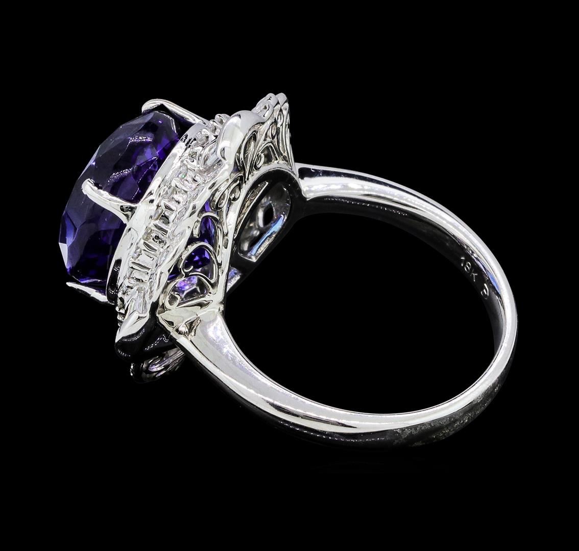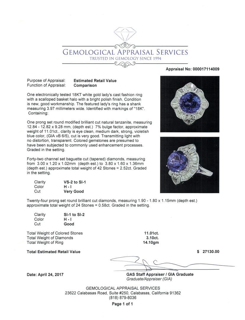 One electronically tested 18KT white gold lady's cast fashion ring with a scalloped basket halo with a bright polish finish. The featured lady's ring has a shank measuring 3.97 millimeters wide. Identified with markings of '18K'. Condition is new, good workmanship. Containing: One prong set round modified brilliant cut natural tanzanite, measuring 12.84 - 12.82 x 9.28 mm, (depth est.) 7%. bulge factor, approximate weight of 11.01ct., clarity is eye clean, medium dark, strong, violetish blue color, (GIA vB 6/5), cut is very good. Transmitting light with no distortion, transparent. Colored gemstones are presumed to have been subjected to commonly used enhancement processes. Graded in the setting. Forty-Two channel set baguette cut (tapered) diamonds, measuring from 3.00 x 1.20 x 1.02mm (depth est.) to 3.80 x 1.60 x 1.36mm (depth est.) approximate total weight of 42 Stones = 2.52ct. Graded in the setting. Color H - I Clarity VS-2 to SI-1 Cut Very Good Twenty-Four prong set round brilliant cut diamonds, measuring 1.90 - 1.80 x 1.15mm (depth est.) approximate total weight of 24 Stones = 0.58ct. Graded in the setting. Color H - I Clarity SI-1 to SI-2 Cut Good. Total Weight of Colored Stones 11.01ct.. Total Weight of Diamonds 3.10ct.. Total Weight of Ring 14.10gm GAS Appraised at $27130.00. GAS Appraised.