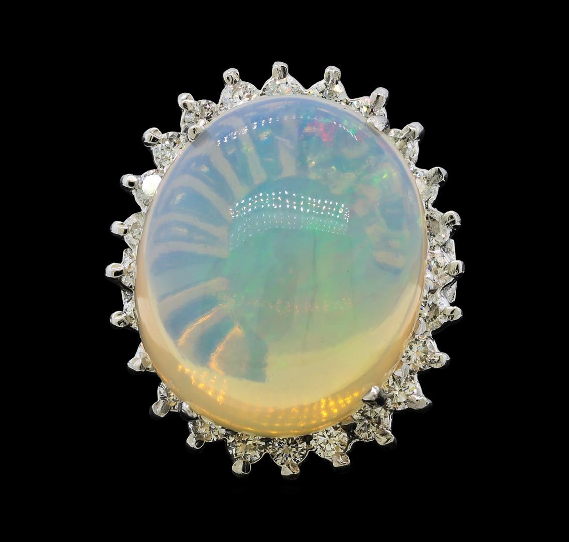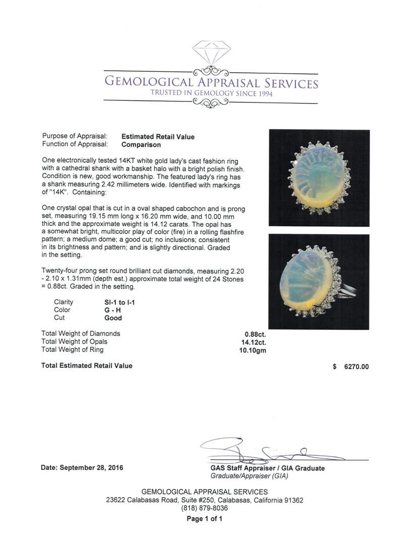 One electronically tested 14KT white gold lady's cast fashion ring with a cathedral shank with a basket halo with a bright polish finish. The featured lady's ring has a shank measuring 2.42 millimeters wide. Identified with markings of '14K'. Condition is new, good workmanship. Containing: One crystal opal that is cut in a oval shaped cabochon and is prong set, measuring 19.15 mm long x 16.20 mm wide, and 10.00 mm thick and the approximate weight is 14.12 carats. The opal has a somewhat bright, multicolor play of color (fire) in a rolling flashfire pattern; a medium dome; a good cut; no inclusions; consistent in its brightness and pattern; and is slightly directional. Graded in the setting. Twenty-Four prong set round brilliant cut diamonds, measuring 2.20 - 2.10 x 1.31mm (depth est.) approximate total weight of 24 Stones = 0.88ct. Graded in the setting. Clarity SI-1 to I-1. Color: G - H Cut Good. Total Weight of Diamonds 0.88ct.. Total Weight of Opals 14.12ct.. Total Weight of Ring 10.10gm. GAS Appraised at $6,270.00.