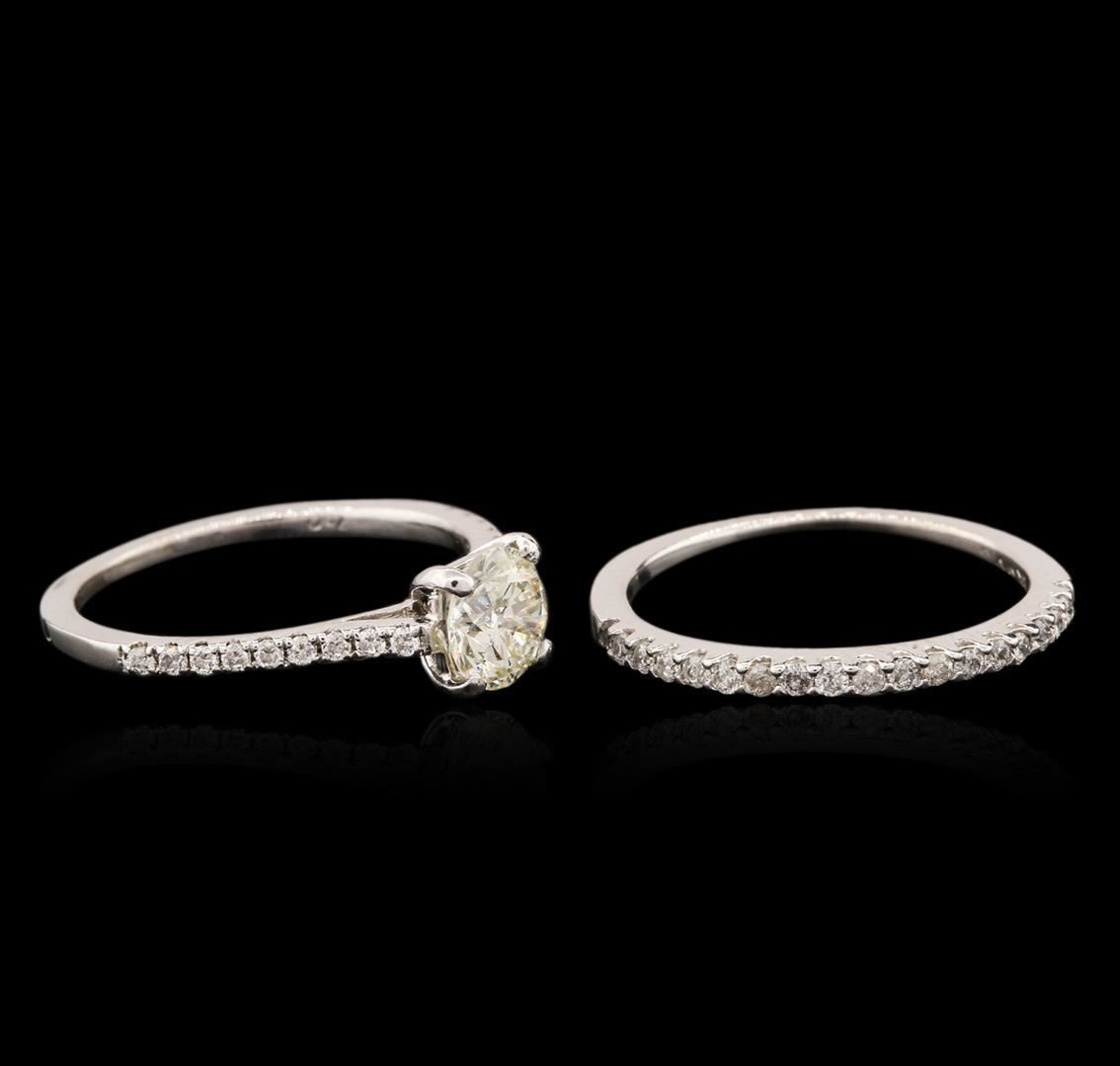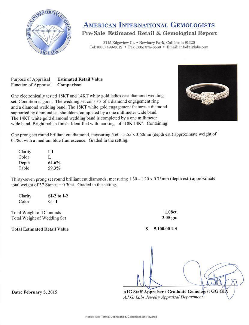 One electronically tested 18KT and 14KT white gold ladies cast diamond wedding set. The wedding set consists of a diamond engagement ring and a diamond wedding band. The 18KT white gold engagement features a diamond supported by diamond set shoulders, completed by a one millimeter wide band. The 14KT white gold diamond wedding band is completed by a one millimeter wide band. Bright polish finish. Identified with markings of "18K 14K". Condition is good. Containing: One prong set round brilliant cut diamond, measuring 5.60 - 5.55 x 3.60mm (depth est.) approximate weight of 0.78ct with a medium blue fluorescence. Graded in the setting. Clarity: I-1. Color: L. Depth 64.6%. Table 59.3%. Thirty-Seven prong set round brilliant cut diamonds, measuring 1.30 - 1.20 x 0.75mm (depth est.) approximate total weight of 37 Stones = 0.30 ct. Graded in the setting. Clarity: SI-2 to I-2. Color: G - I. Total Weight of Diamonds 1.08ct. Total Weight of Wedding Set 3.05 grams. AIG Appraised.