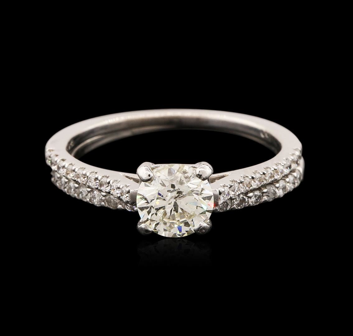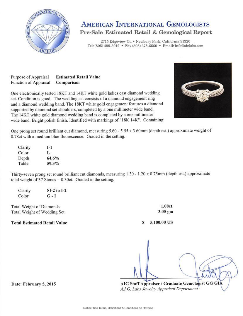 One electronically tested 18KT and 14KT white gold ladies cast diamond wedding set. The wedding set consists of a diamond engagement ring and a diamond wedding band. The 18KT white gold engagement features a diamond supported by diamond set shoulders, completed by a one millimeter wide band. The 14KT white gold diamond wedding band is completed by a one millimeter wide band. Bright polish finish. Identified with markings of "18K 14K". Condition is good. Containing: One prong set round brilliant cut diamond, measuring 5.60 - 5.55 x 3.60mm (depth est.) approximate weight of 0.78ct with a medium blue fluorescence. Graded in the setting. Clarity: I-1. Color: L. Depth 64.6%. Table 59.3%. Thirty-Seven prong set round brilliant cut diamonds, measuring 1.30 - 1.20 x 0.75mm (depth est.) approximate total weight of 37 Stones = 0.30ct. Graded in the setting. Clarity: SI-2 to I-2. Color: G - I. Total Weight of Diamonds 1.08ct. Total Weight of Wedding Set 3.05 grams. AIG Appraised at $5,100.00.