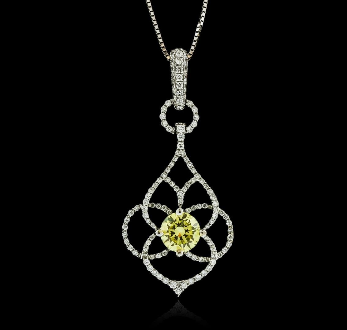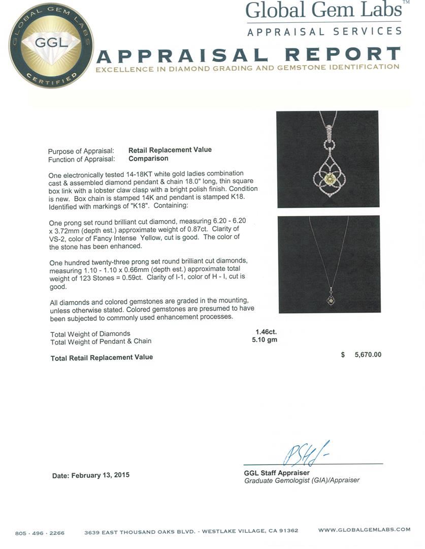 One electronically tested 14-18KT white gold ladies combination cast & assembled diamond pendant & chain 18.0" long, thin square box link with a lobster claw clasp with a bright polish finish. Box chain is stamped 14K and pendant is stamped K18. Identified with markings of "K18". Condition is new. Containing: One prong set round brilliant cut diamond, measuring 6.20 - 6.20 x 3.72mm (depth est.) approximate weight of 0.87ct. Clarity: VS-2, Cut is Good. The color of the stone has been enhanced. One Hundred Twenty-Three prong set round brilliant cut diamonds, measuring 1.10 - 1.10 x 0.66mm (depth est.) approximate total weight of 123 Stones = 0.59ct. Clarity: I-1. Color: H - I, Cut is Good. All diamonds and colored gemstones are graded in the mounting, unless otherwise stated. Colored gemstones are presumed to have been subjected to commonly used enhancement processes. Total Weight of Diamonds 1.46ct. Total Weight of Pendant & Chain 5.10 grams. GGL Appraised at $5,670.00.