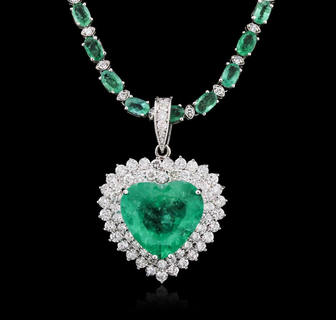 One electronically tested 14KT and 18KT white gold ladies cast & assembled emerald and diamond necklace. Eighteen and one-half inch length necklace features an 18KT white gold pendant consisting of a heart shaped emerald set within two tiered diamond bezel, completed by a diamond set bail. The necklace is supported by a 14KT white gold flexible emerald and diamond ribbon, terminating in a concealed clasp with safety. Bright polish finish. Identified with markings of "K14 18K". Condition is new, good workmanship. Containing: One prong set heart mixed cut natural emerald, measuring 14.40 x 15.80 x 9.20mm, 6% bulge factor, approximate weight of 11.77ct., clarity is heavily included, type III, medium dark, very slightly grayish, very slightly bluish green color, (GIA vslbG 6/3), cut is good. Transmitting light with a minimum of distortion, transparent. Naturally occurring internal & external characteristics are present. Indications of oil residue. Colored Stone Grading Report attached. Graded in the setting. Sixty-four prong set oval mixed cut natural emeralds, measuring 5.00 x 3.00 x 1.95mm, 6% bulge factor, approximate total weight of 11.52ct., clarity is heavily included, type III, medium dark, very slightly grayish, very slightly bluish green color, (GIA vslbG 6/3), cut is good. Transmitting light somewhat diffusely, transparent to translucent. Naturally occurring internal & external characteristics are present. Measurements & the color grade are an average for the group. Indications of oil residue. Graded in the setting. Fifty-Five prong set round brilliant cut diamonds, measuring 2.30 - 2.00 x 1.29mm (depth est.) approximate total weight of 55 Stones = 2.10ct. Graded in the setting. Clarity: SI-1 to I-1. Color: G - I Seventy-One prong set round brilliant cut diamonds, measuring 1.90 - 1.80 x 1.11mm (depth est.) approximate total weight of 71 Stones = 1.74ct. Graded in the setting. Clarity: SI-2 to I-1. Color: G - I. Total Weight of Colored Stones 23.29ct. Total Weight of Diamonds 3.84ct. Total Weight of Necklace 28.23 grams. AIG Appraised at $47,415.00.
