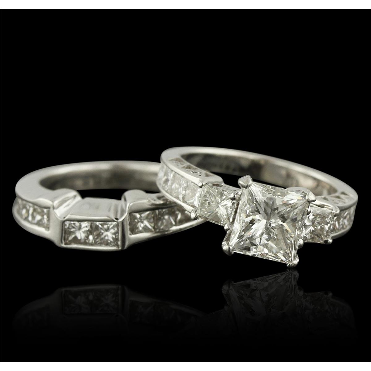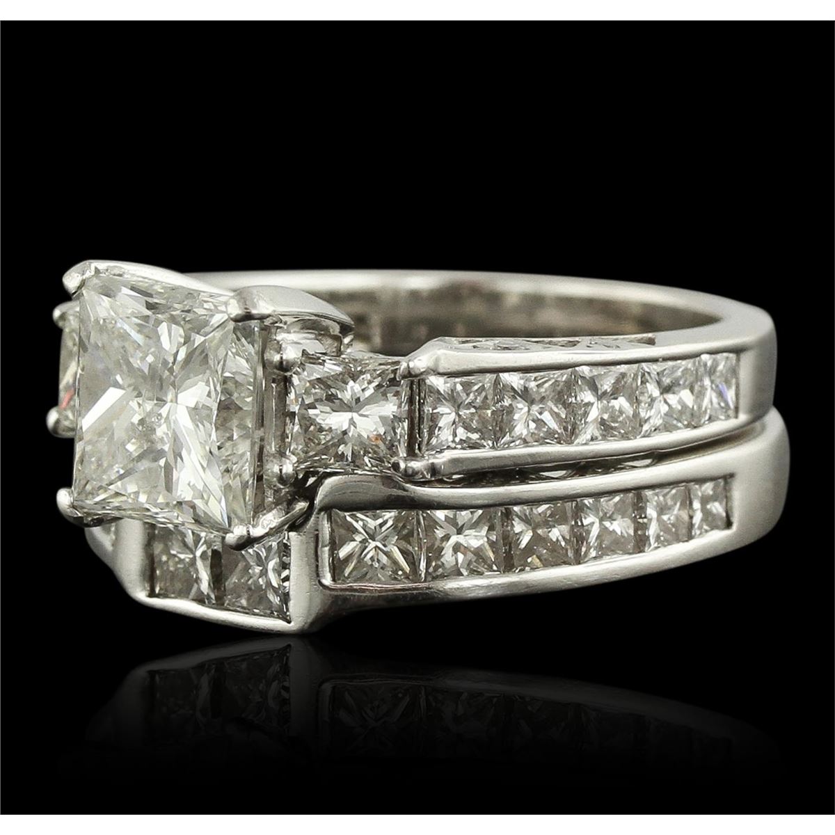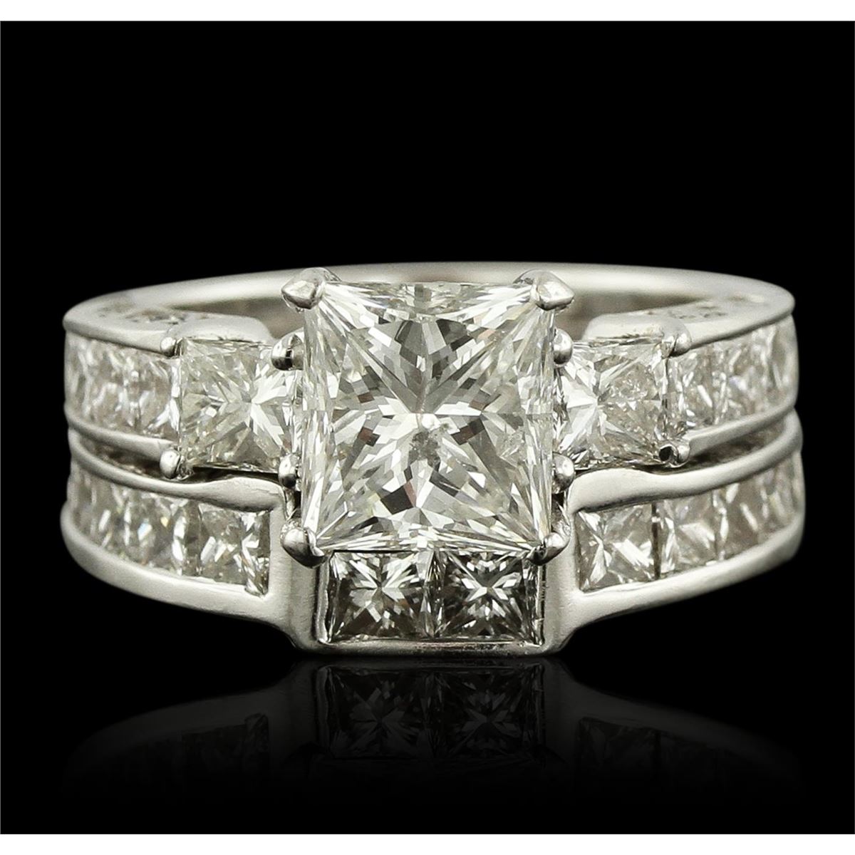 One electronically tested 14-18KT white gold lady's combination cast & assembled engagement ring and guard with a bright polish finish. Identified with markings of "18K". Condition is very good. Containing: One prong set princess cut diamond, measuring 7.90 x 7.74 x 5.00mm (depth est.) approximate weight of 2.59ct. Clarity: I-1. Color: I, Cut is Good. The diamond has been treated with fracture filled method. Two prong set princess cut diamonds, measuring 3.50 x 3.50 x 2.63mm (depth est.) approximate total weight of 2 Stones = 0.53ct. Clarity: VS-2. Color: I, Cut is Good. Twenty-Four channel set princess cut diamonds, measuring 2.50 x 2.50 x 1.88mm (depth est.) approximate total weight of 24 Stones = 2.31ct. Clarity: VS-2 to SI-1. Color: I, Cut is Good. Total Weight of Diamonds 5.43ct. Total Weight of Engagement Ring And Guard 12.10 grams. GGL Appraised at $42,190.00.