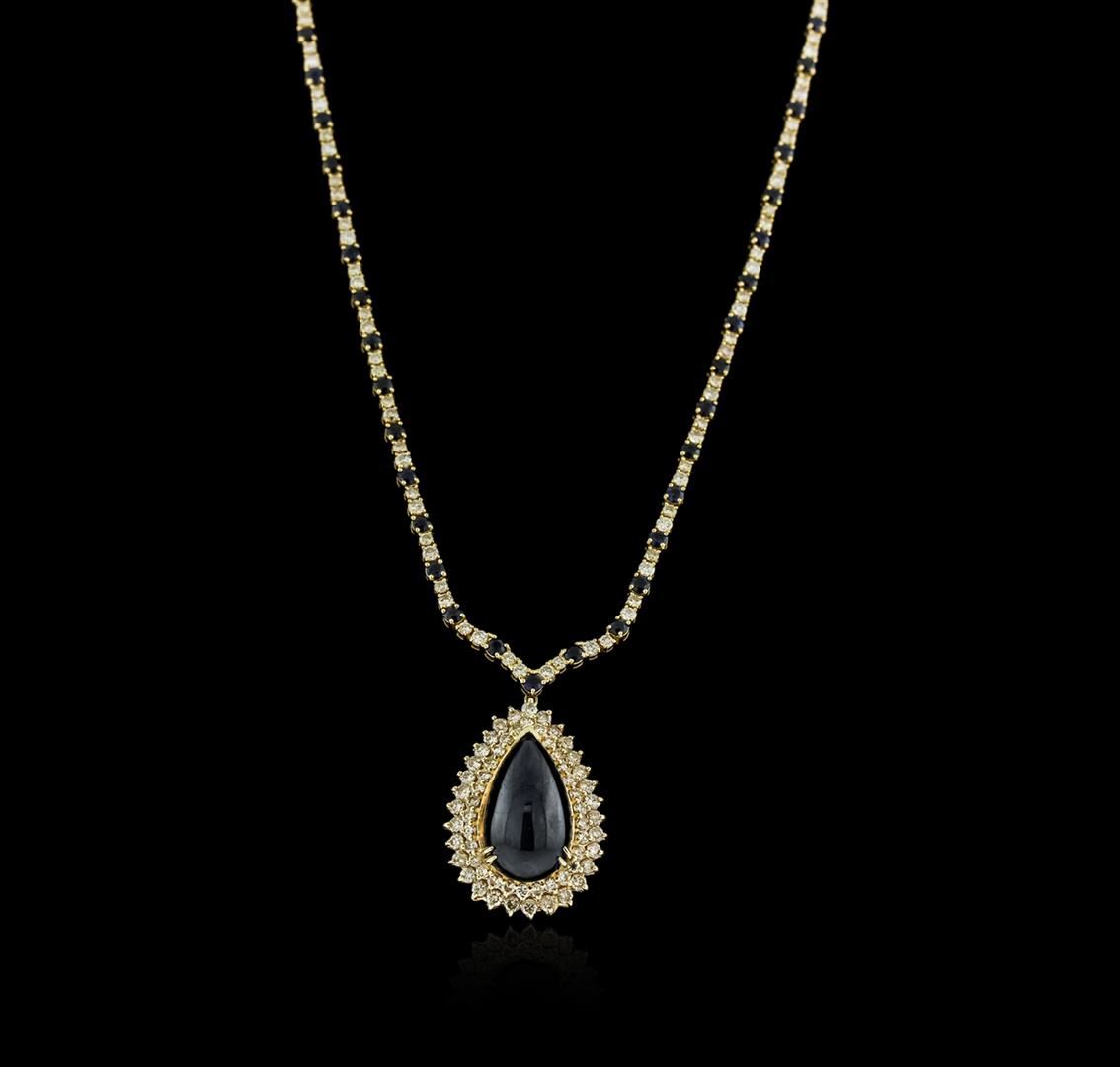 One electronically tested 14-18KT yellow gold ladies cast sapphire and diamond necklace with a hidden box clasp with safety closer with a bright polish finish. Measurements: 14" in length Identified with markings of "14K 750". Condition is new. Containing: One prong set pear cabochon cut natural blue sapphire, measuring 23.00 x 14.00 x 9.10mm, approximate weight of 31.65ct., clarity is heavily included, type II, dark, moderately strong, blue color, (GIA B 7/4), cut is good. Forty-five prong set round modified brilliant cut natural blue sapphires, measuring 3.00 - 3.00 x 1.95 mm, approximate total weight of 6.30ct., clarity is slightly included, type II, medium dark, moderately strong, blue color, (GIA B 6/4), cut is good. One Hundred Fifty-Three prong set round brilliant cut diamonds, measuring 2.50 - 2.30 x 1.44mm (depth est.) approximate total weight of 153 Stones = 7.74ct. Clarity: SI-1 to I-1. Color: K - L, Cut is Good. Colored gemstones are presumed to have been subjected to commonly used enhancement processes. All diamonds and colored gemstones are graded in the mounting, unless otherwise stated. Total Weight of Colored Stones 37.95ct. Total Weight of Diamonds 7.74ct. Total Weight of Necklace 41.70 grams. GGL Appraised at $25,330.00.