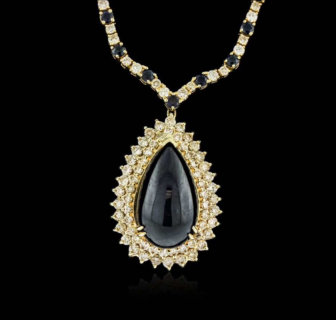 One electronically tested 14-18KT yellow gold ladies cast sapphire and diamond necklace with a hidden box clasp with safety closer with a bright polish finish. Measurements: 14" in length Identified with markings of "14K 750". Condition is new. Containing: One prong set pear cabochon cut natural blue sapphire, measuring 23.00 x 14.00 x 9.10mm, approximate weight of 31.65ct., clarity is heavily included, type II, dark, moderately strong, blue color, (GIA B 7/4), cut is good. Forty-five prong set round modified brilliant cut natural blue sapphires, measuring 3.00 - 3.00 x 1.95 mm, approximate total weight of 6.30ct., clarity is slightly included, type II, medium dark, moderately strong, blue color, (GIA B 6/4), cut is good. One Hundred Fifty-Three prong set round brilliant cut diamonds, measuring 2.50 - 2.30 x 1.44mm (depth est.) approximate total weight of 153 Stones = 7.74ct. Clarity: SI-1 to I-1. Color: K - L, Cut is Good. Colored gemstones are presumed to have been subjected to commonly used enhancement processes. All diamonds and colored gemstones are graded in the mounting, unless otherwise stated. Total Weight of Colored Stones 37.95ct. Total Weight of Diamonds 7.74ct. Total Weight of Necklace 41.70 grams. GGL Appraised at $25,330.00.