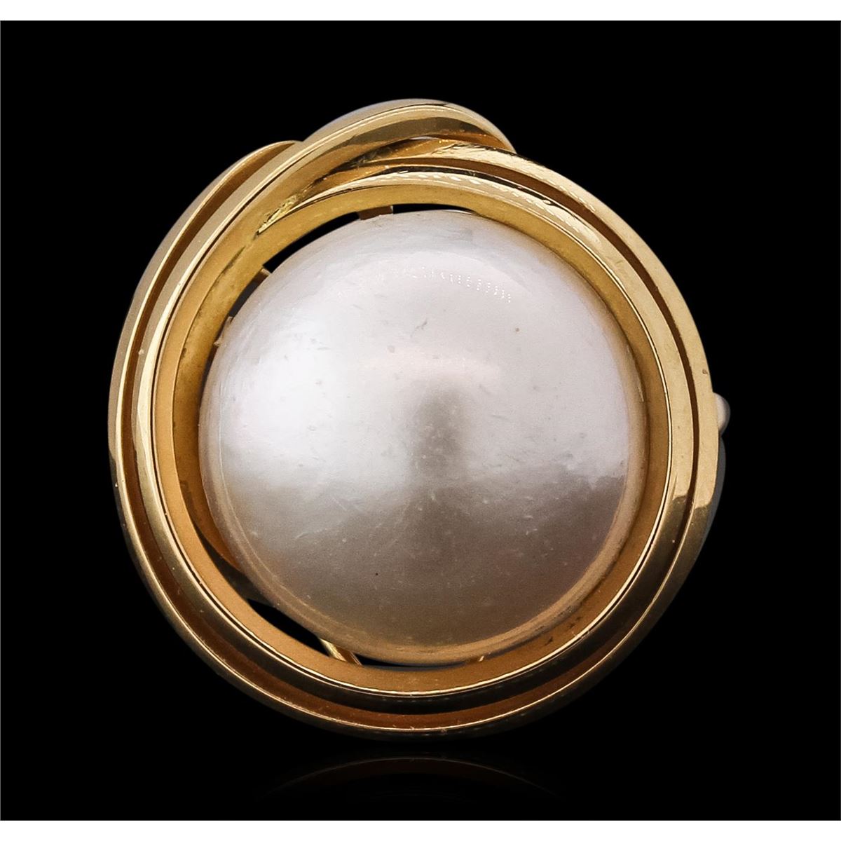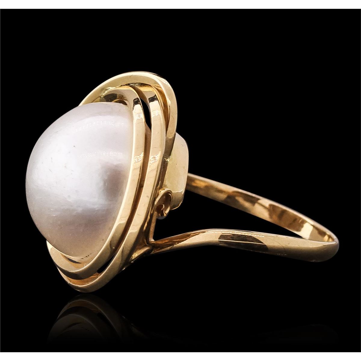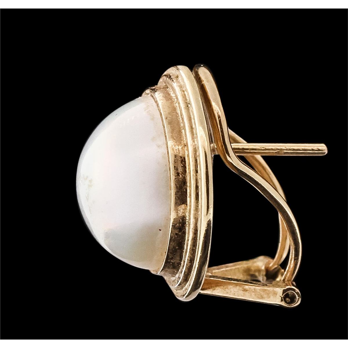 One set electronically tested 14-18KT yellow gold ladies combination cast & assembled ring and earrings with Omega clip backs with a bright polish finish. Identified with markings of "14K-18K". Condition is very good. Containing: 30 mabe pearls, 14.7mm in size to 13.0mm in size. The pearls are white in color with a good luster, lightly blemished. Total Weight of Ring And Earrings 18.70 grams. GGL Appraised at $2,695.00.