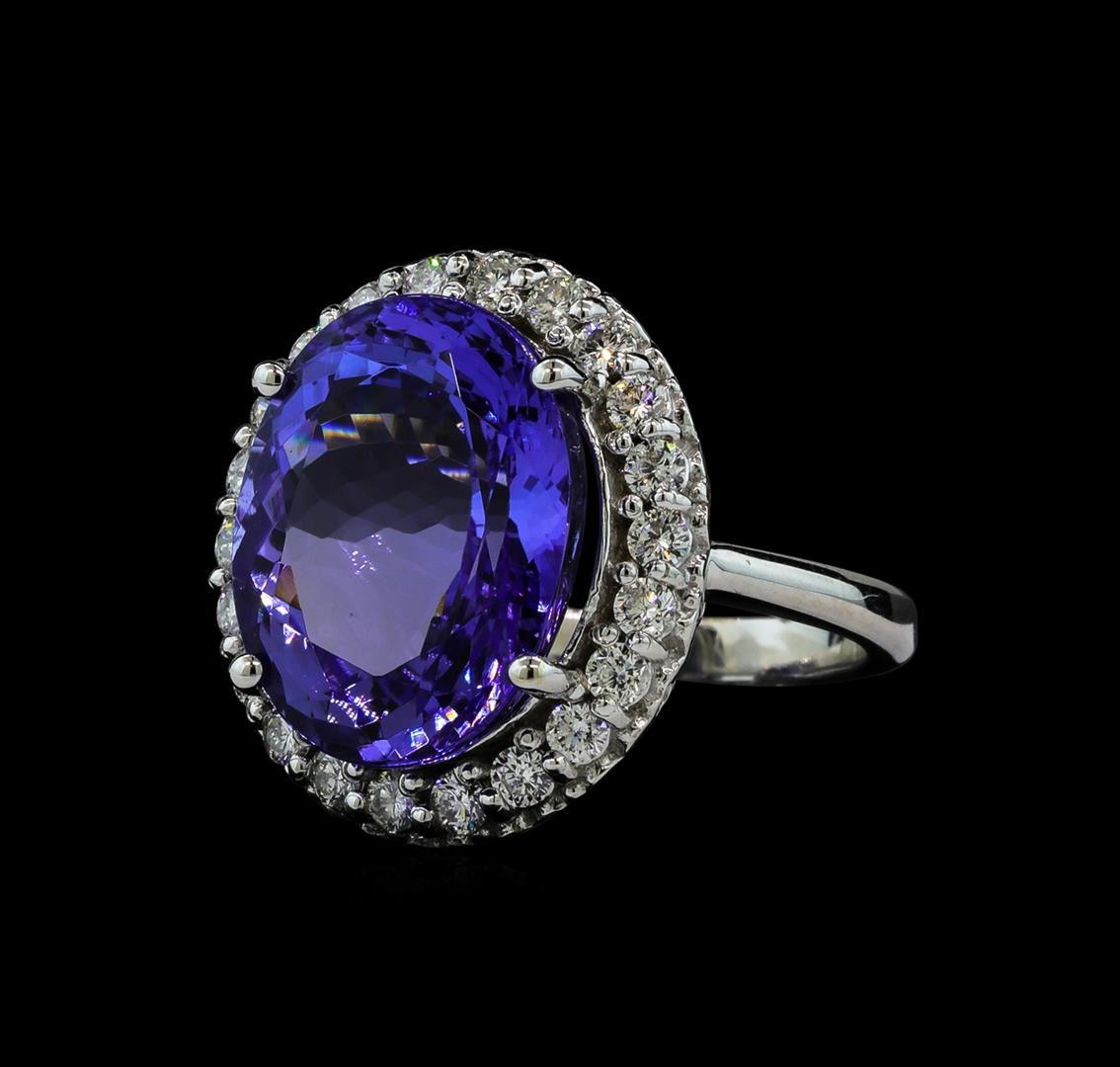 One electronically tested 14KT white gold lady's cast fashion ring with a basket halo with a bright polish finish. The featured lady's ring has a shank measuring 2.53 millimeters wide. Identified with markings of '14K'. Condition is new, good workmanship. Containing: One prong set oval modified brilliant cut natural tanzanite, measuring 16.77 x 13.45 x 8.64mm, (depth est.) 3%. bulge factor, approximate weight of 14.20ct., clarity is eye clean, medium light, very slightly grayish, violet color, (GIA V 4/3), cut is very good. Transmitting light with no distortion, transparent. Colored gemstones are presumed to have been subjected to commonly used enhancement processes. Graded in the setting. Twenty-Two prong set round brilliant cut diamonds, measuring 2.25 - 2.15 x 1.36mm (depth est.) approximate total weight of 22 Stones = 0.88ct. Graded in the setting. Clarity SI-1 to I-1. Color: H - I Cut Good. Total Weight of Colored Stones 14.20ct.. Total Weight of Diamonds 0.88ct.. Total Weight of Ring 10.40gm GAS Appraised at $15,970.00.