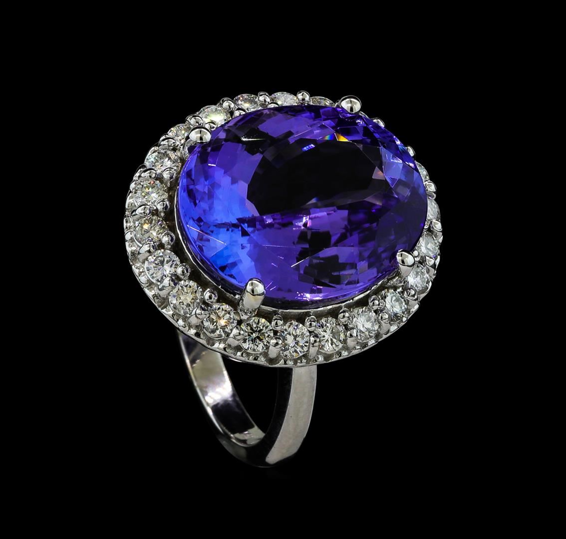 One electronically tested 14KT white gold lady's cast fashion ring with a basket halo with a bright polish finish. The featured lady's ring has a shank measuring 2.53 millimeters wide. Identified with markings of '14K'. Condition is new, good workmanship. Containing: One prong set oval modified brilliant cut natural tanzanite, measuring 16.77 x 13.45 x 8.64mm, (depth est.) 3%. bulge factor, approximate weight of 14.20ct., clarity is eye clean, medium light, very slightly grayish, violet color, (GIA V 4/3), cut is very good. Transmitting light with no distortion, transparent. Colored gemstones are presumed to have been subjected to commonly used enhancement processes. Graded in the setting. Twenty-Two prong set round brilliant cut diamonds, measuring 2.25 - 2.15 x 1.36mm (depth est.) approximate total weight of 22 Stones = 0.88ct. Graded in the setting. Clarity SI-1 to I-1. Color: H - I Cut Good. Total Weight of Colored Stones 14.20ct.. Total Weight of Diamonds 0.88ct.. Total Weight of Ring 10.40gm GAS Appraised at $15,970.00.