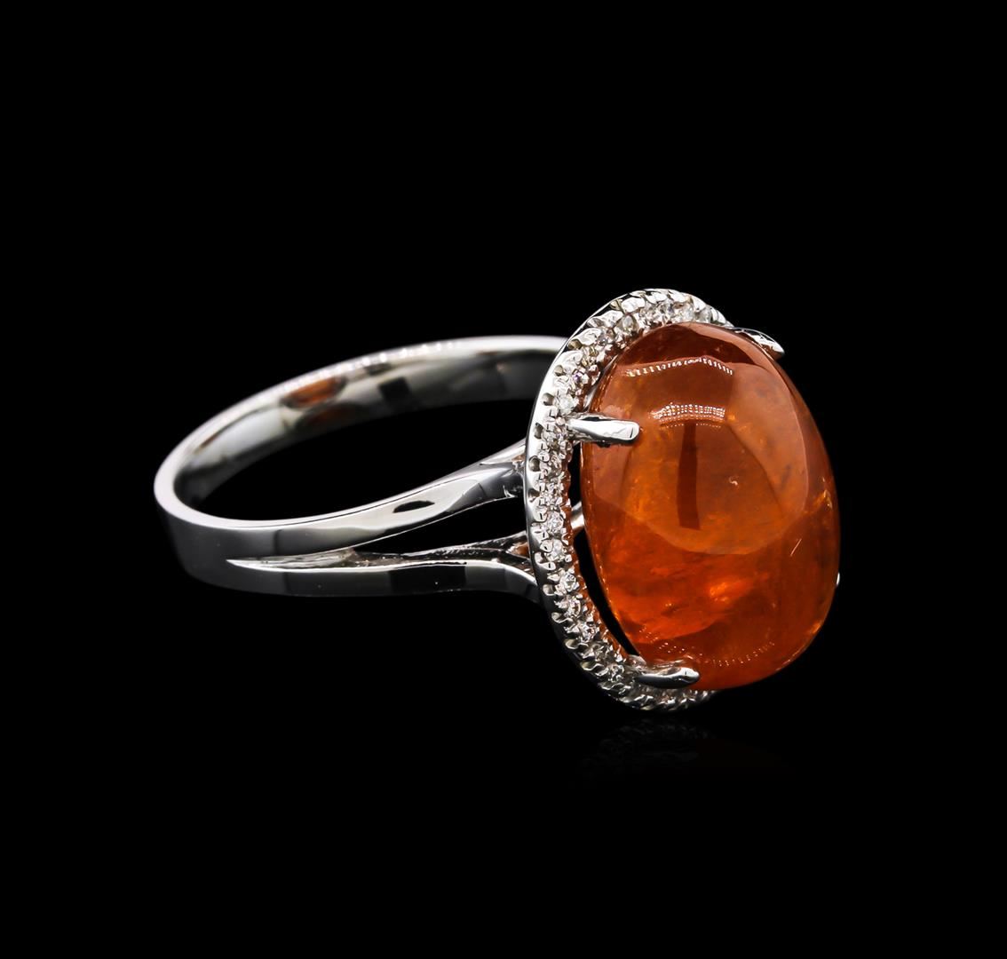 One electronically tested 14KT white gold lady's cast fashion ring with a bright polish finish. The featured lady's ring has a shank measuring 2.47 millimeters wide. Identified with markings of "K14". Condition is new, good workmanship. Containing: Thirty-Eight split prong set round brilliant cut diamonds, measuring 1.10 - 0.95 x 0.62mm (depth est.) approximate total weight of 38 Stones = 0.15ct. Graded in the setting. Clarity: SI-1 to SI-2. Color: G - I. Cut Good One prong set cabochon cabochon cut natural spessartite garnet, measuring 14.20 x 10.60 x 8.42mm, approximate weight of 14.20ct., clarity is moderately included, type II, medium dark, very slightly brownish, reddish orange color, (GIA rO 6/3), cut is good. Colored gemstones are presumed to have been subjected to commonly used enhancement processes. Graded in the setting. Total Weight of Colored Stones 14.20ct. Total Weight of Diamonds 0.15ct. Total Weight of Ring 6.30gm at $4325.00.. GAS Appraised at $4,325.00.