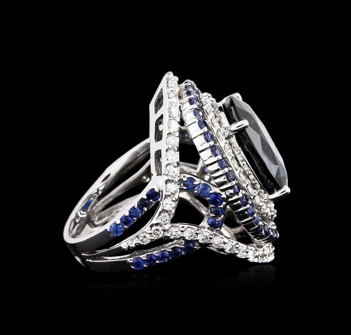 One electronically tested 18KT white gold ladies cast sapphire and diamond ring with a bright polish finish. The featured sapphire is set within tiered sapphire and diamond bezels supported by elaborate sapphire and diamond set three-way split shoulders, completed by a three and one-half millimeter wide band. Identified with markings of "18K". Condition is new, good workmanship. Containing: One prong set oval mixed cut natural blue sapphire, measuring 14.80 x 12.41 x 7.71mm, 6% bulge factor, approximate weight of 12.28ct., clarity is eye clean, type II, dark, very slightly grayish, blue color, (GIA B 7/3), cut is good. Transmitting light with no distortion, transparent. No indications of heating. GIA Gemological Report attached. Graded in the GIA Laboratory, Report #2161929026.Sixty-six prong set round mixed cut natural blue sapphires, measuring 1.90 - 1.80 x 1.20 mm, approximate total weight of 1.93ct., clarity is eye clean, type II, medium dark, moderately strong, violetish blue color, (GIA vB 6/4), cut is good. Transmitting light with no distortion, transparent. Color grade is an average for the group. Graded in the setting. Seventy-Two prong set round brilliant cut diamonds, measuring 1.70 - 1.60 x 0.99mm (depth est.) approximate total weight of 72 Stones = 1.34ct. Graded in the setting. Clarity: VS-1 to VS-2. Color: G - I. Total Weight of Colored Stones 14.21ct. Total Weight of Diamonds 1.34ct. Total Weight of Ring 17.09 grams. AIG Appraised at $189,490.00.
