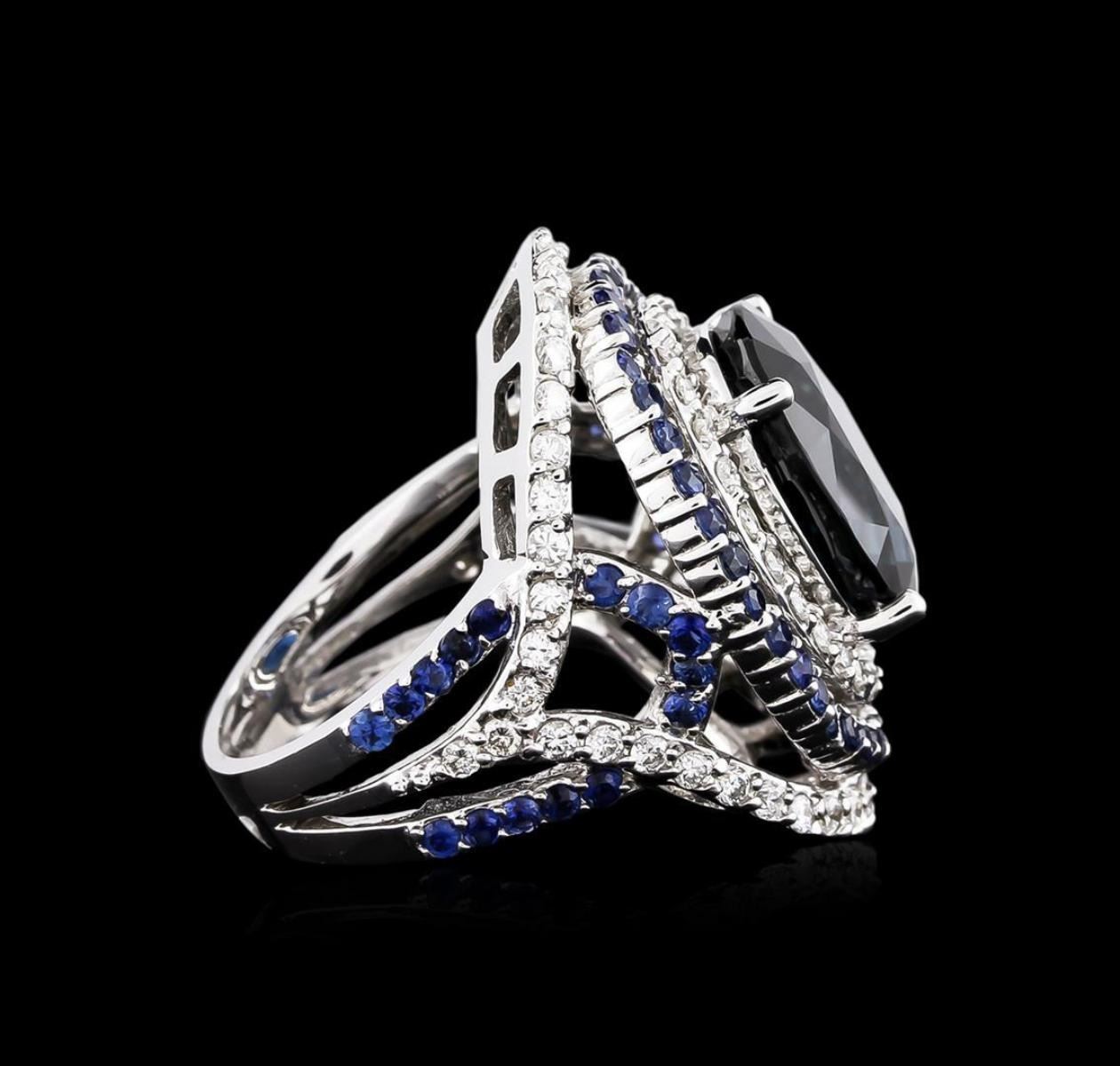 One electronically tested 18KT white gold ladies cast sapphire and diamond ring with a bright polish finish. The featured sapphire is set within tiered sapphire and diamond bezels supported by elaborate sapphire and diamond set three-way split shoulders, completed by a three and one-half millimeter wide band. Identified with markings of "18K". Condition is new, good workmanship. Containing: One prong set oval mixed cut natural blue sapphire, measuring 14.80 x 12.41 x 7.71mm, 6% bulge factor, approximate weight of 12.28ct., clarity is eye clean, type II, dark, very slightly grayish, blue color, (GIA B 7/3), cut is good. Transmitting light with no distortion, transparent. No indications of heating. GIA Gemological Report attached. Graded in the GIA Laboratory, Report #2161929026.Sixty-six prong set round mixed cut natural blue sapphires, measuring 1.90 - 1.80 x 1.20 mm, approximate total weight of 1.93ct., clarity is eye clean, type II, medium dark, moderately strong, violetish blue color, (GIA vB 6/4), cut is good. Transmitting light with no distortion, transparent. Color grade is an average for the group. Graded in the setting. Seventy-Two prong set round brilliant cut diamonds, measuring 1.70 - 1.60 x 0.99mm (depth est.) approximate total weight of 72 Stones = 1.34ct. Graded in the setting. Clarity: VS-1 to VS-2. Color: G - I. Total Weight of Colored Stones 14.21ct. Total Weight of Diamonds 1.34ct. Total Weight of Ring 17.09 grams. AIG Appraised.