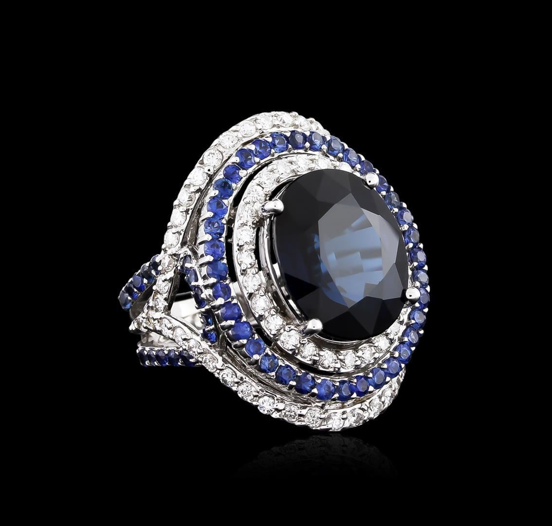 One electronically tested 18KT white gold ladies cast sapphire and diamond ring with a bright polish finish. The featured sapphire is set within tiered sapphire and diamond bezels supported by elaborate sapphire and diamond set three-way split shoulders, completed by a three and one-half millimeter wide band. Identified with markings of "18K". Condition is new, good workmanship. Containing: One prong set oval mixed cut natural blue sapphire, measuring 14.80 x 12.41 x 7.71mm, 6% bulge factor, approximate weight of 12.28ct., clarity is eye clean, type II, dark, very slightly grayish, blue color, (GIA B 7/3), cut is good. Transmitting light with no distortion, transparent. No indications of heating. GIA Gemological Report attached. Graded in the GIA Laboratory, Report #2161929026.Sixty-six prong set round mixed cut natural blue sapphires, measuring 1.90 - 1.80 x 1.20 mm, approximate total weight of 1.93ct., clarity is eye clean, type II, medium dark, moderately strong, violetish blue color, (GIA vB 6/4), cut is good. Transmitting light with no distortion, transparent. Color grade is an average for the group. Graded in the setting. Seventy-Two prong set round brilliant cut diamonds, measuring 1.70 - 1.60 x 0.99mm (depth est.) approximate total weight of 72 Stones = 1.34ct. Graded in the setting. Clarity: VS-1 to VS-2. Color: G - I. Total Weight of Colored Stones 14.21ct. Total Weight of Diamonds 1.34ct. Total Weight of Ring 17.09 grams. AIG Appraised.