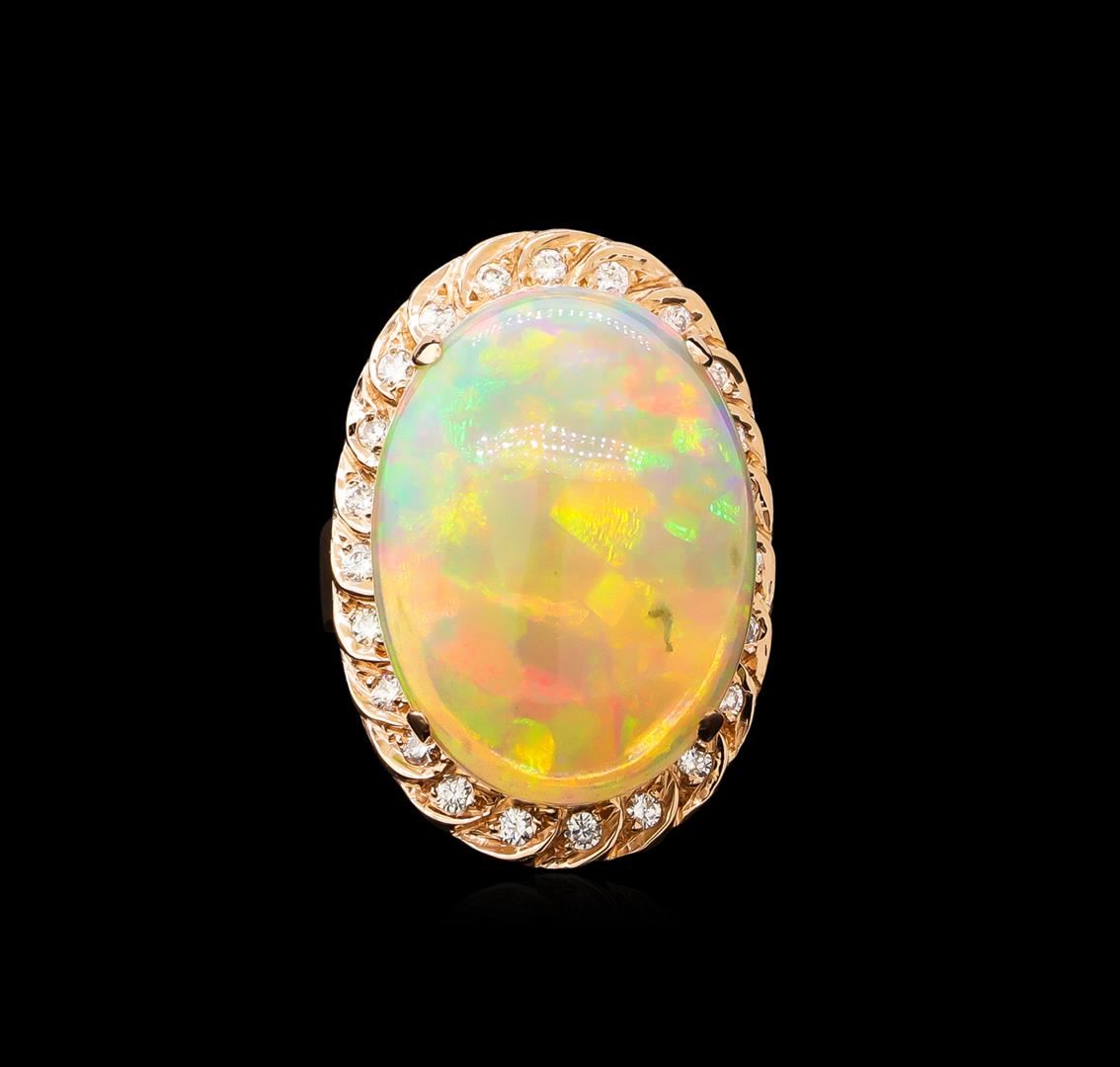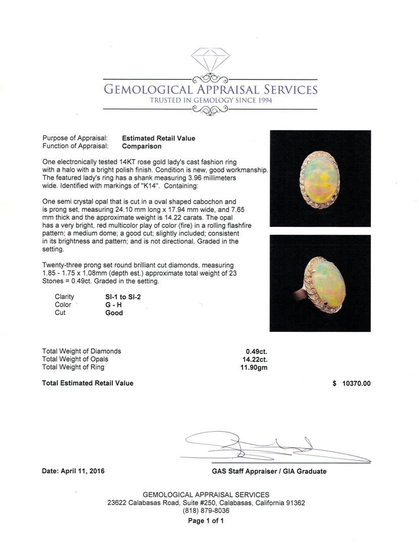 One electronically tested 14KT rose gold lady's cast fashion ring with a halo with a bright polish finish. The featured lady's ring has a shank measuring 3.96 millimeters wide. Identified with markings of "K14". Condition is new, good workmanship. Containing: One semi crystal opal that is cut in a oval shaped cabochon and is prong set, measuring 24.10 mm long x 17.94 mm wide, and 7.65 mm thick and the approximate weight is 14.22 carats. The opal has a very bright, red multicolor play of color (fire) in a rolling flashfire pattern; a medium dome; a good cut; slightly included; consistent in its brightness and pattern; and is not directional. Graded in the setting. Twenty-Three prong set round brilliant cut diamonds, measuring 1.85 - 1.75 x 1.08mm (depth est.) approximate total weight of 23 Stones = 0.49ct. Graded in the setting. Clarity: SI-1 to SI-2. Color: G - H. Cut Good. Total Weight of Diamonds 0.49ct. Total Weight of Opals 14.22ct. Total Weight of Ring 11.90gm. GAS Appraised at $10,370.00.